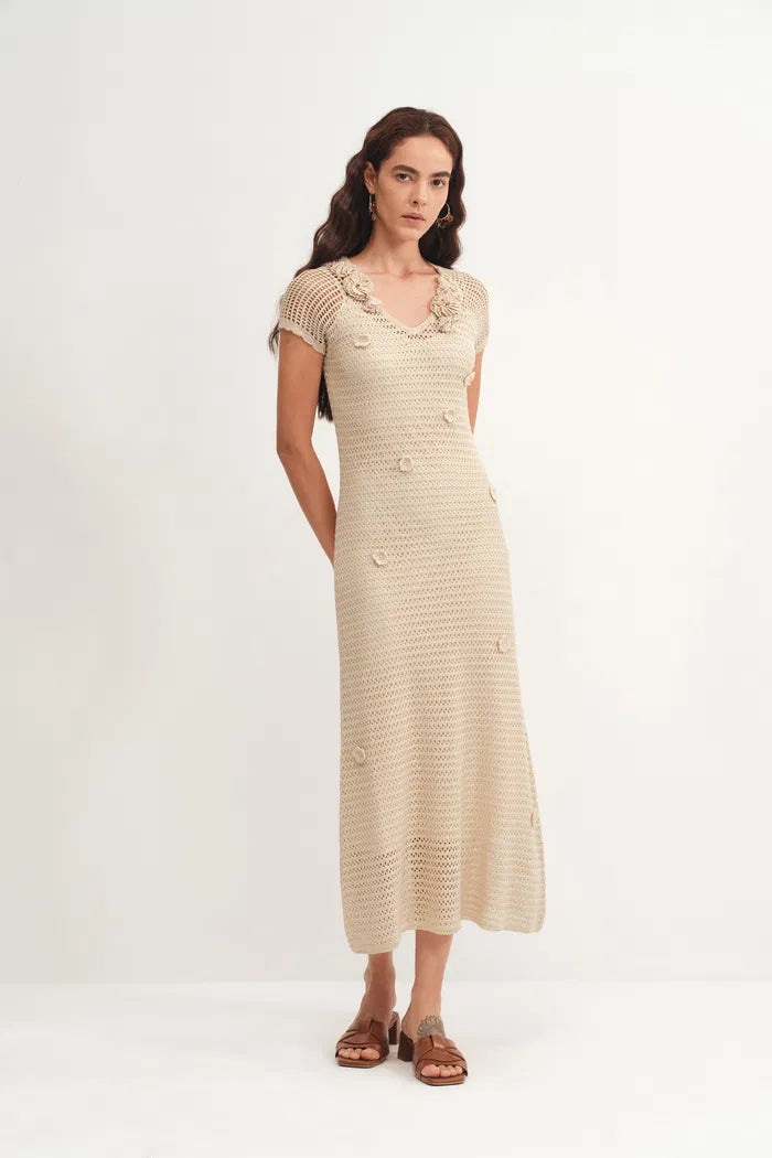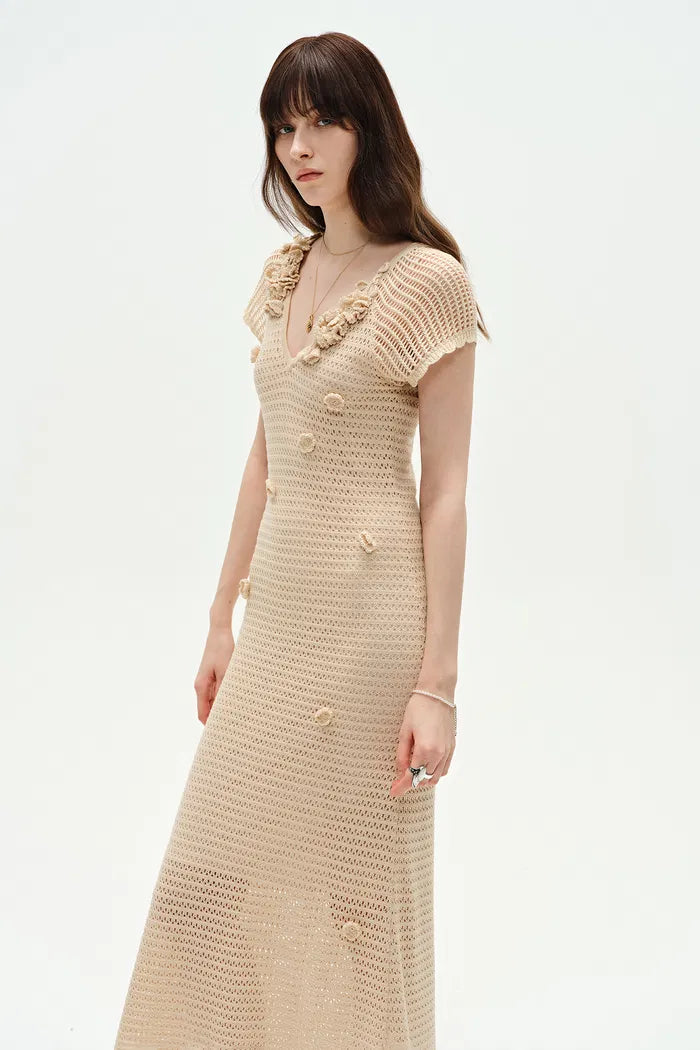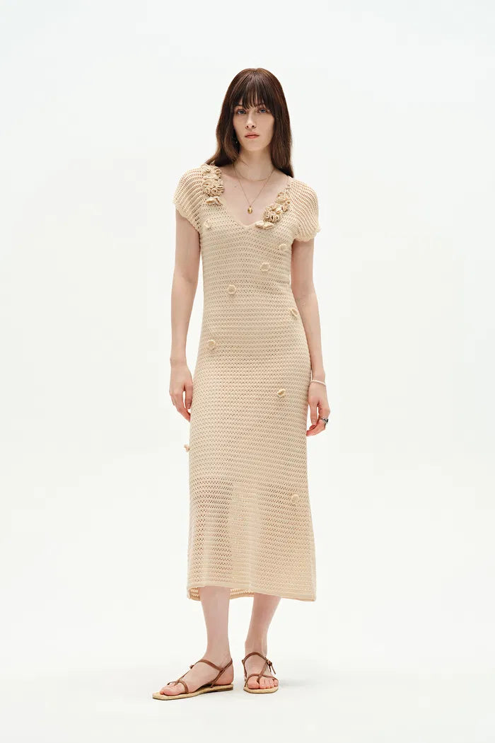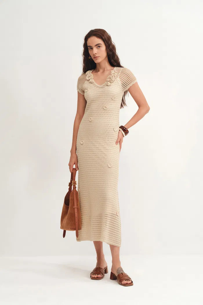 Une robe qui célèbre l'artisanat. Chaque fleur est crochetée individuellement, créant un jardin de textures. Le mélange cachemire-lyocell est aussi doux que des nuages tout en gardant magnifiquement sa forme.