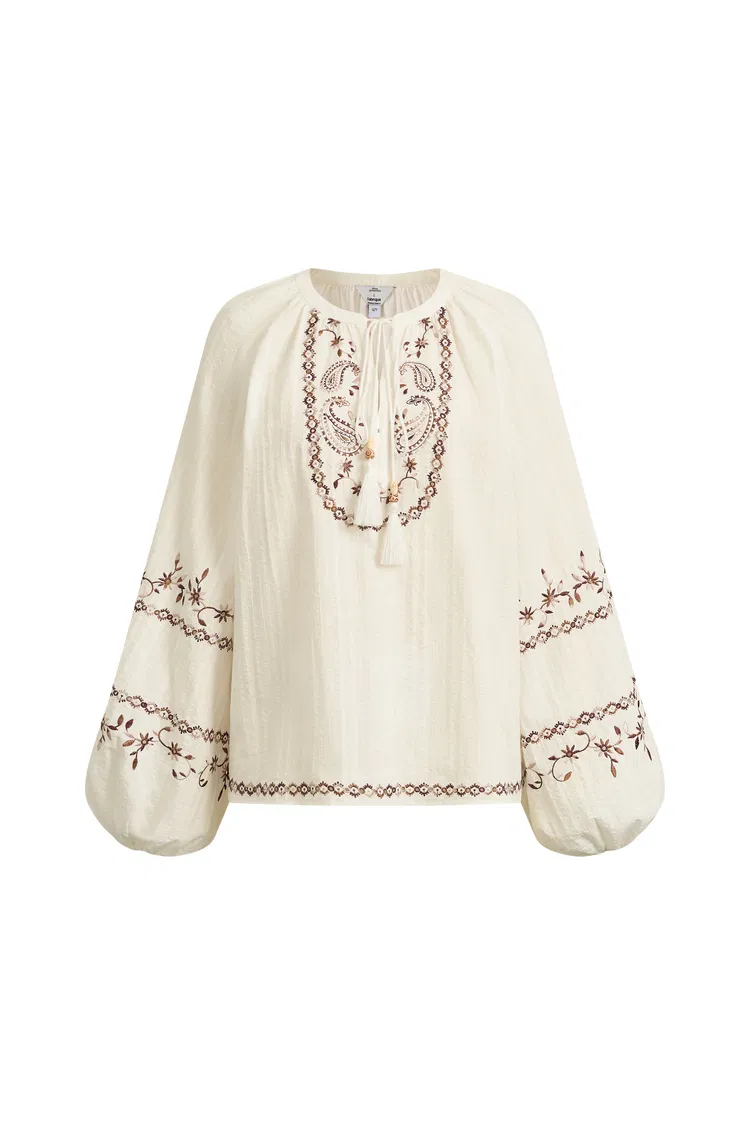 Cette chemise oversize présente une broderie cachemire en fils dégradés pour une touche subtile bohème. Les liens à pompons perlés et le tissu léger capturent une sensation de légèreté, en faisant une couche parfaite pour la brise d'été.