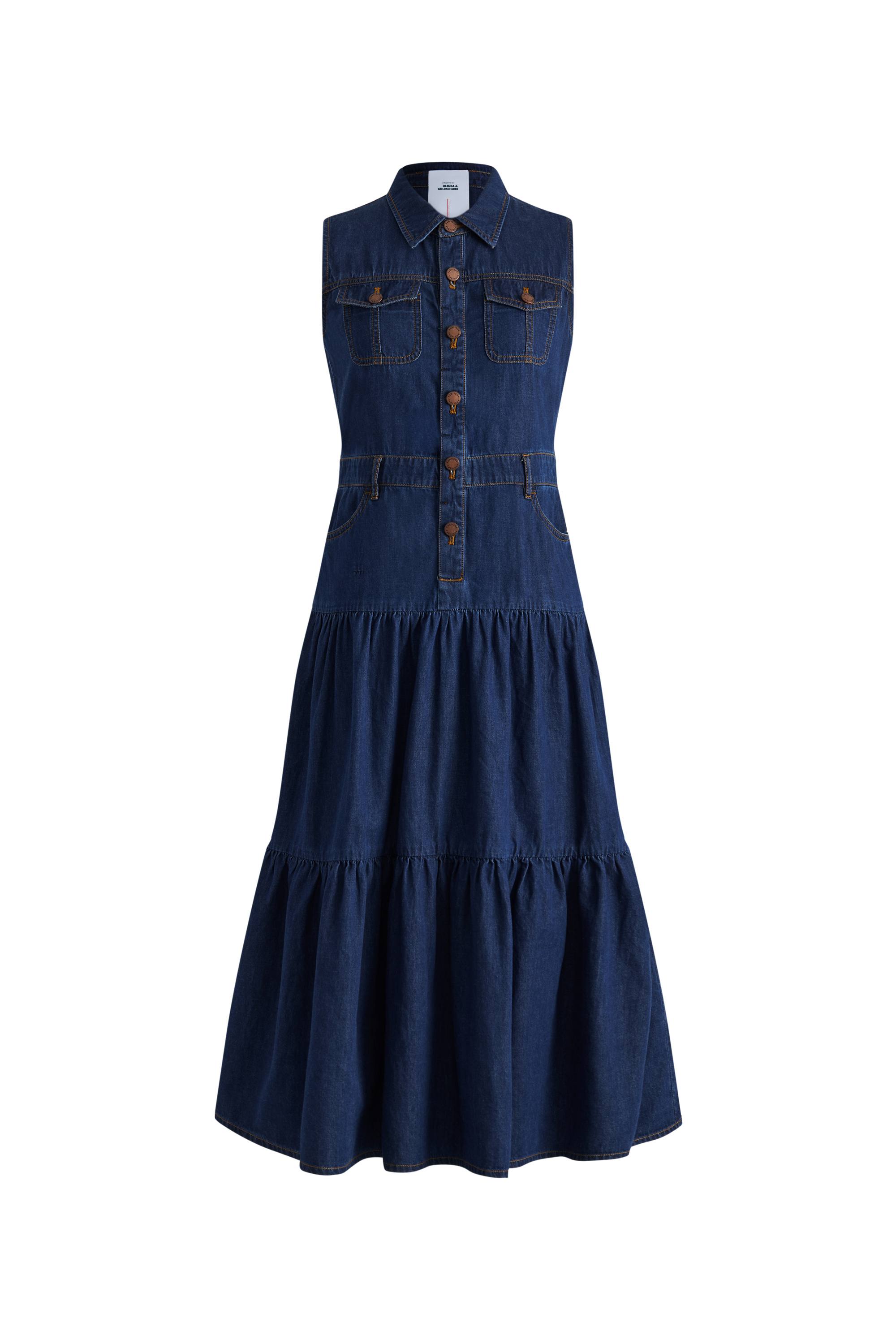 Confectionnée en denim premium, cette robe cintrée à la taille et évasée avec une jupe à volants pleine apporte un charme vintage tout en mettant en valeur votre silhouette. Le lavage foncé passe facilement du jour à la soirée.