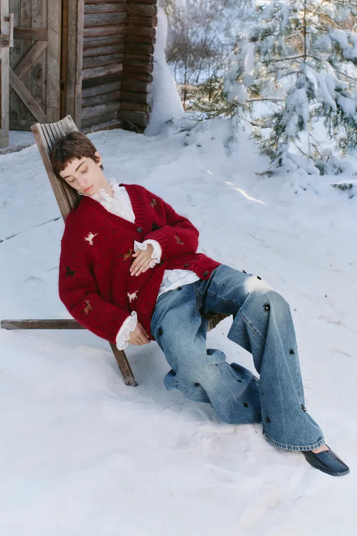 Un cardigan inspiré du zodiaque où les perles et le point de croix sont intégrés dans le tricot au lieu d’être posés dessus. Le fil mélangé et moelleux adoucit le motif cheval, lui donnant un aspect tactile et collectible qui convient aussi au port quotidien.