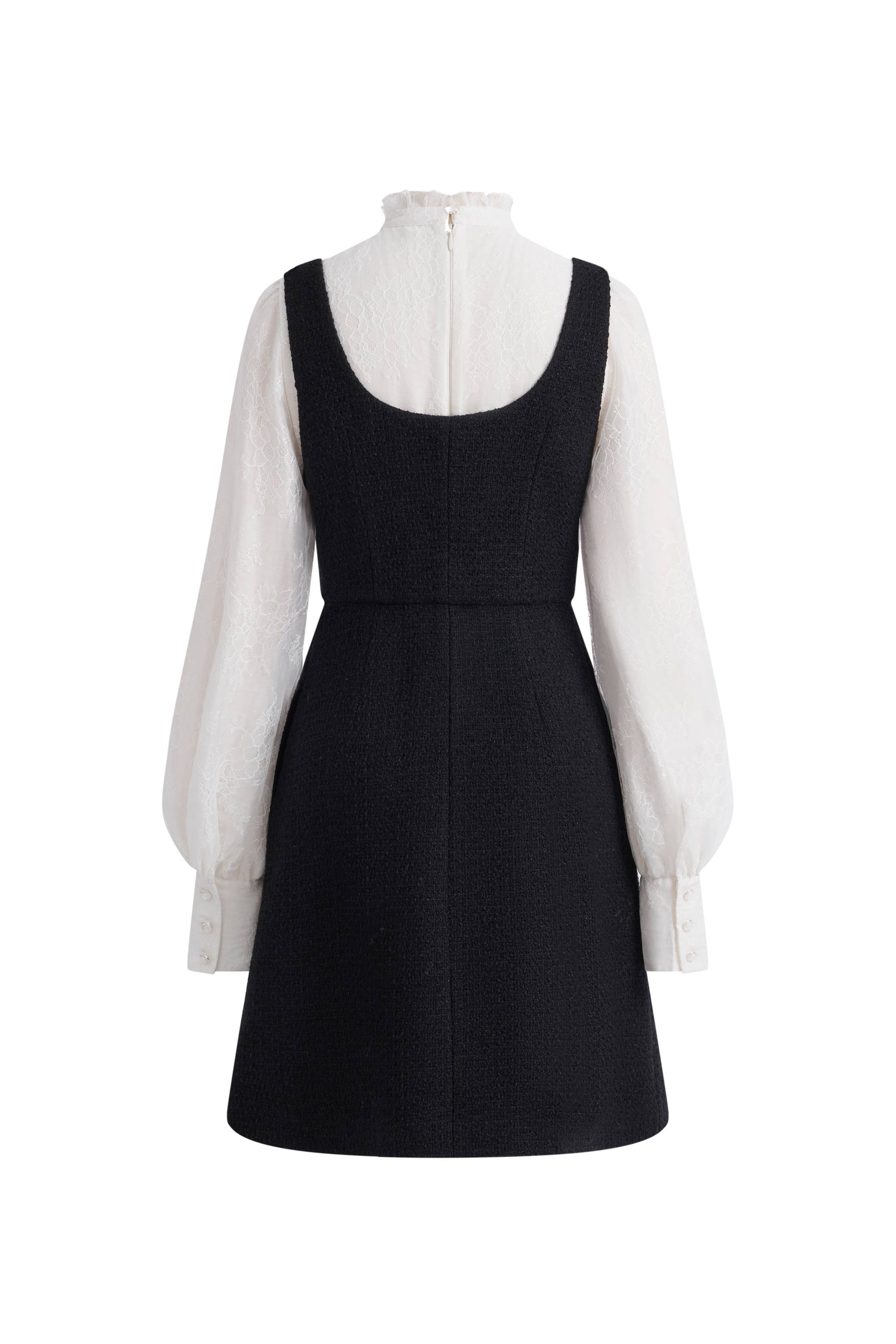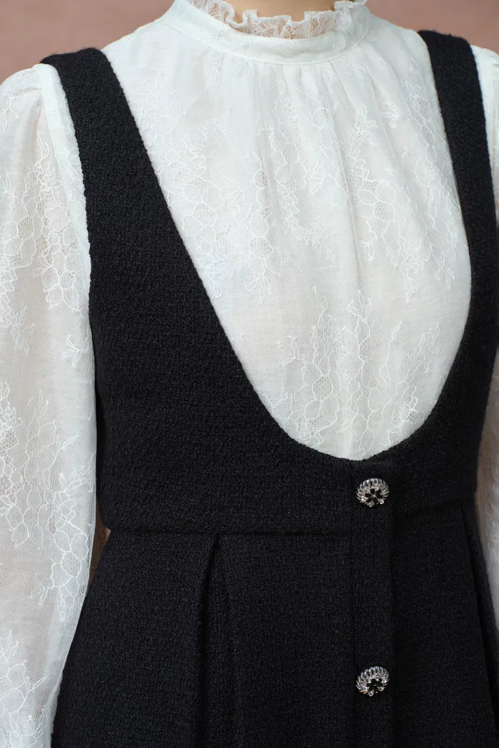 Une blouse en dentelle et une combinaison en tweed coupées en une seule pièce, conçues pour structurer sans volume. La dentelle définit l'encolure et les épaules, tandis que la taille en tweed lisse et encadre le corps pour une silhouette féminine structurée, à la fois élégante et légère.