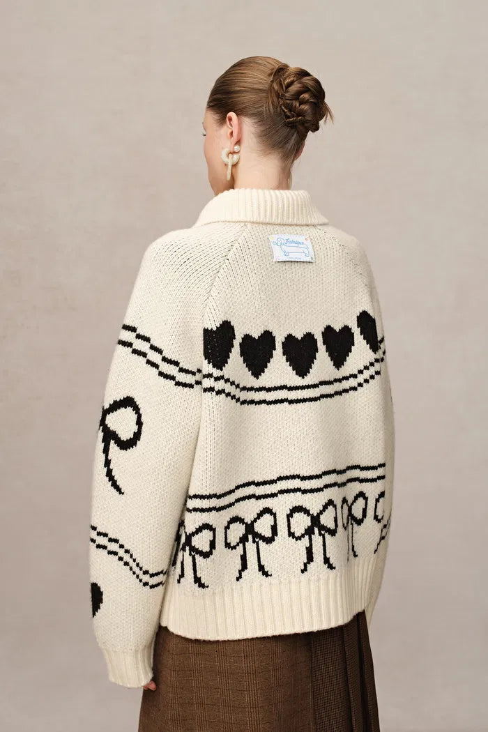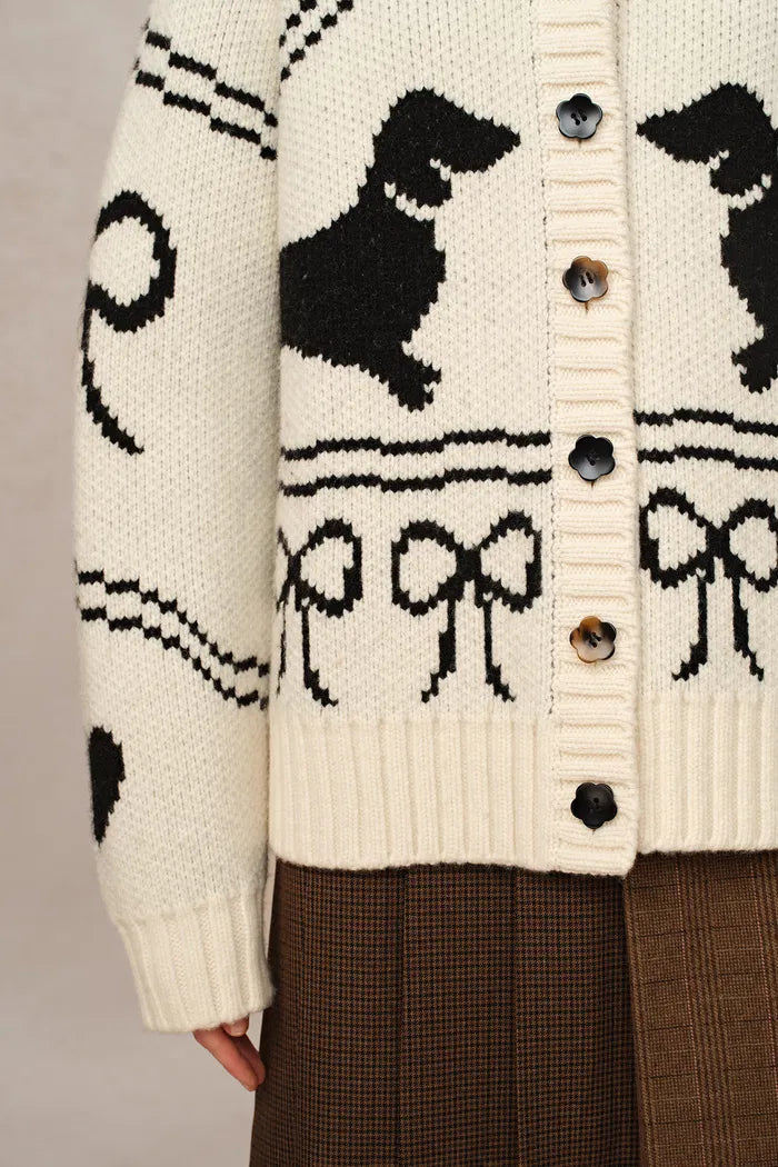 Le fantaisiste se pare d'une touche laineuse. La grosse laine mérinos présente des teckels et des nœuds ludiques, tandis que des boutons fleurs d'inspiration vintage ajoutent du charme. C'est le genre de cardigan qui fait demander : « Où as-tu trouvé ça ? »