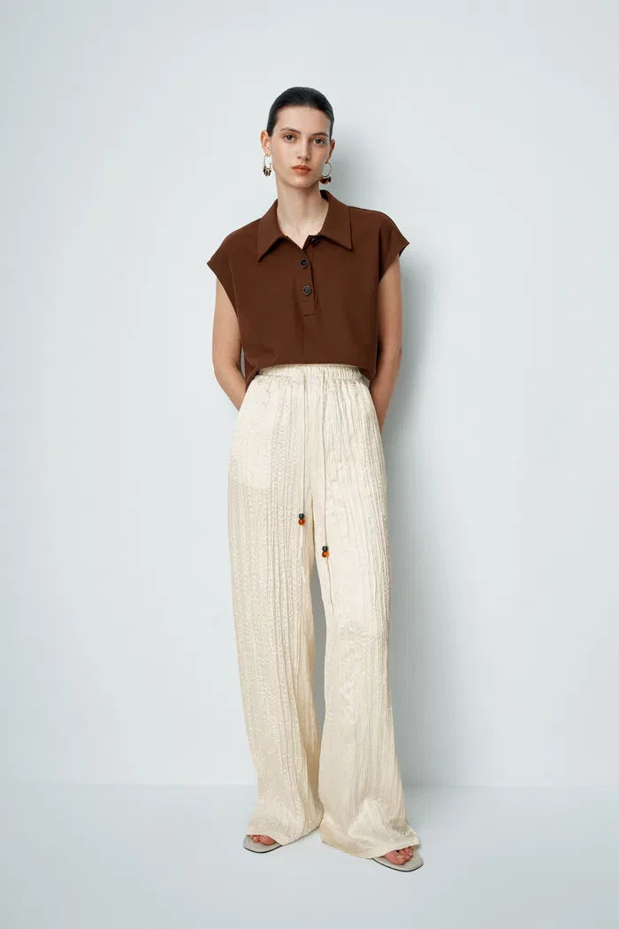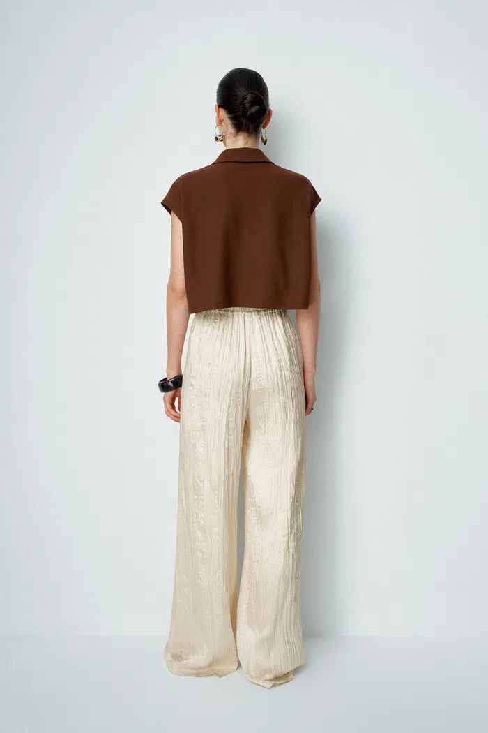 Ces pantalons en satin plissé apportent un intérêt textural aux silhouettes décontractées. La large ceinture élastique présente un cordon contrastant orné de perles, tandis que les poches cachées ajoutent de la praticité. En crème chaud avec une finition froissée, ce sont les essentiels polyvalents dont votre garde-robe estivale avait besoin.