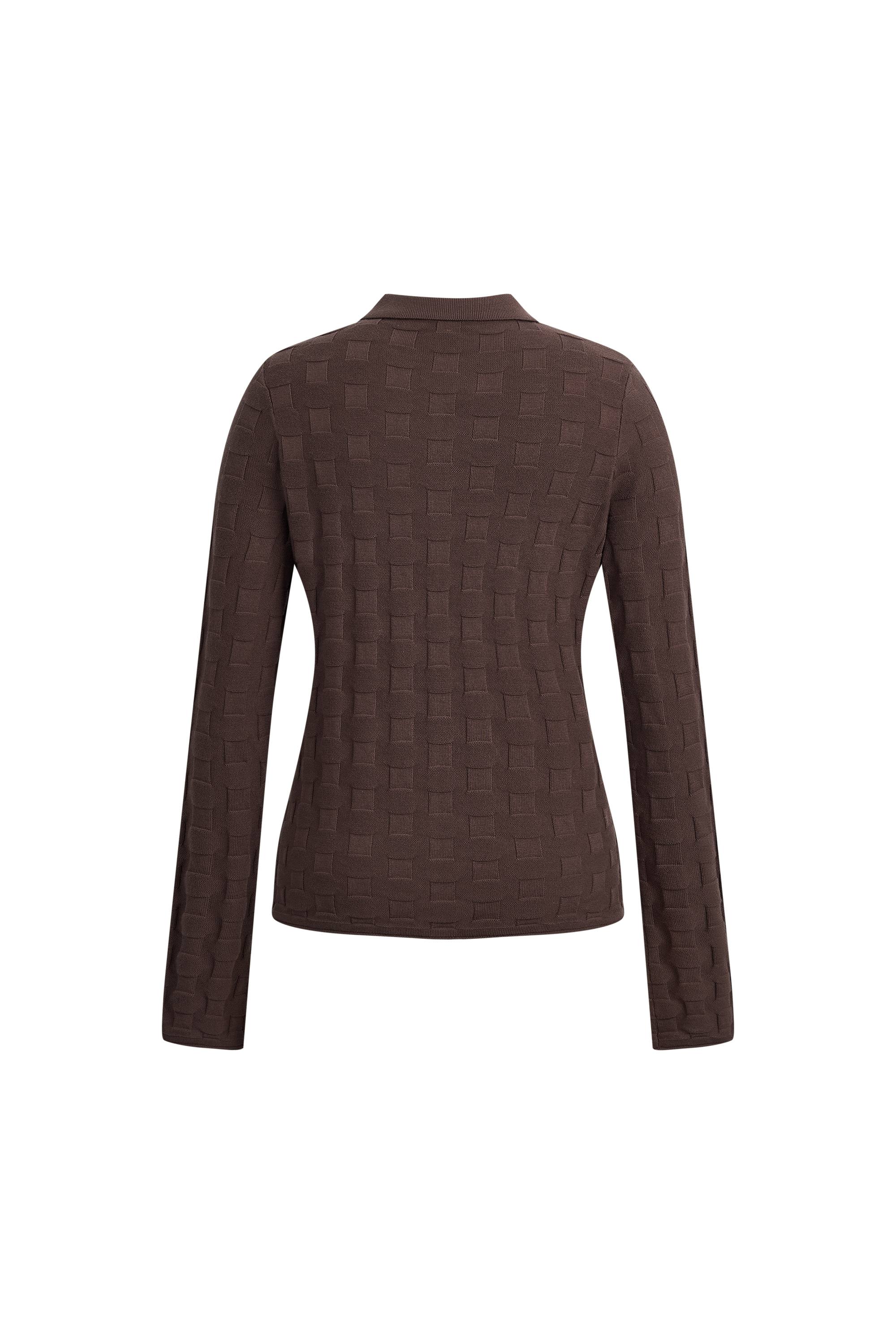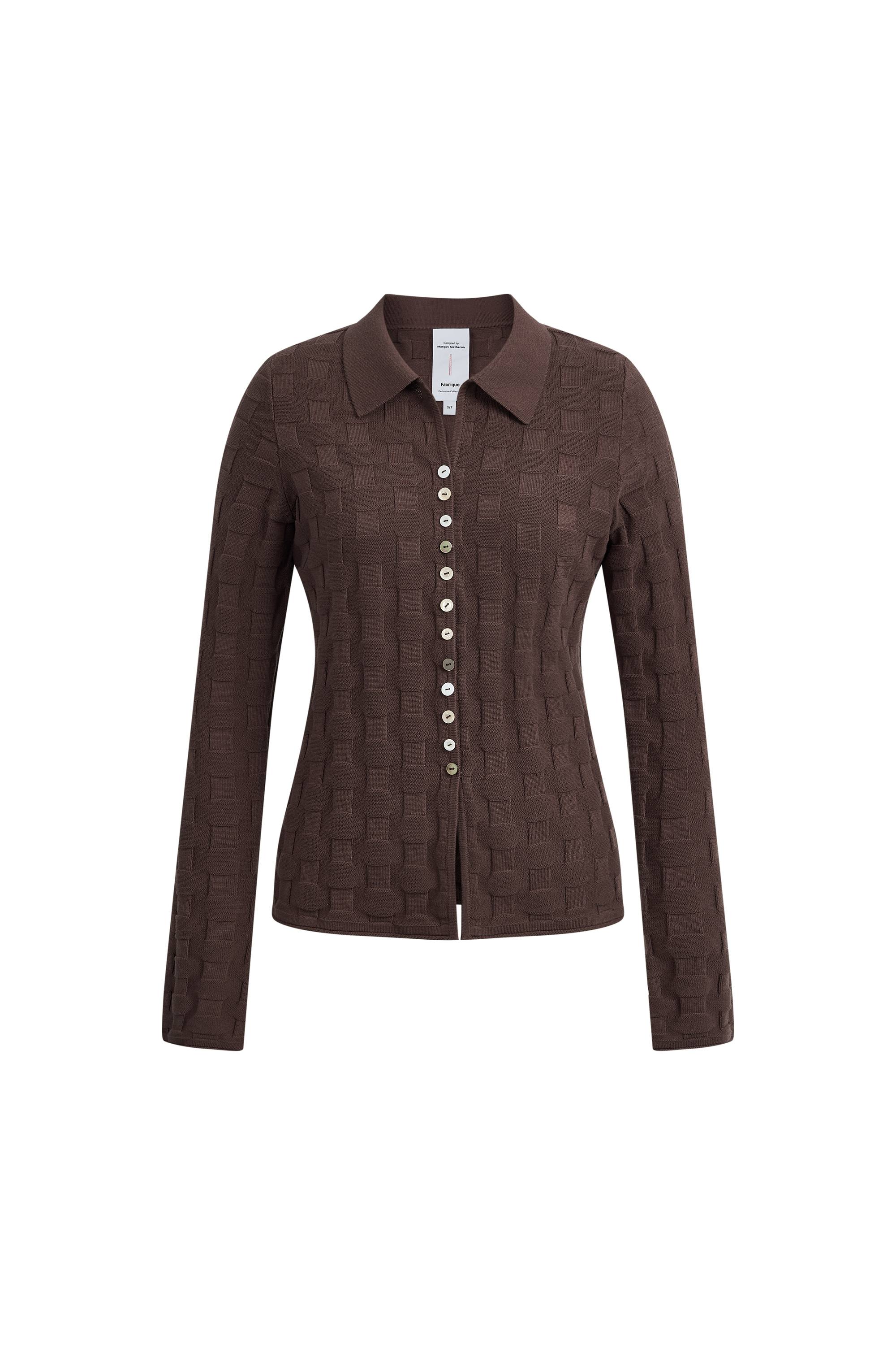 Ce cardigan marron chêne présente un tissage damier tactile qui apporte une touche fraîche et en 3D à un motif rétro. Tricoté en coton fin, il offre une coupe respirante avec des boutons en nacre artisanaux pour une finition soignée.