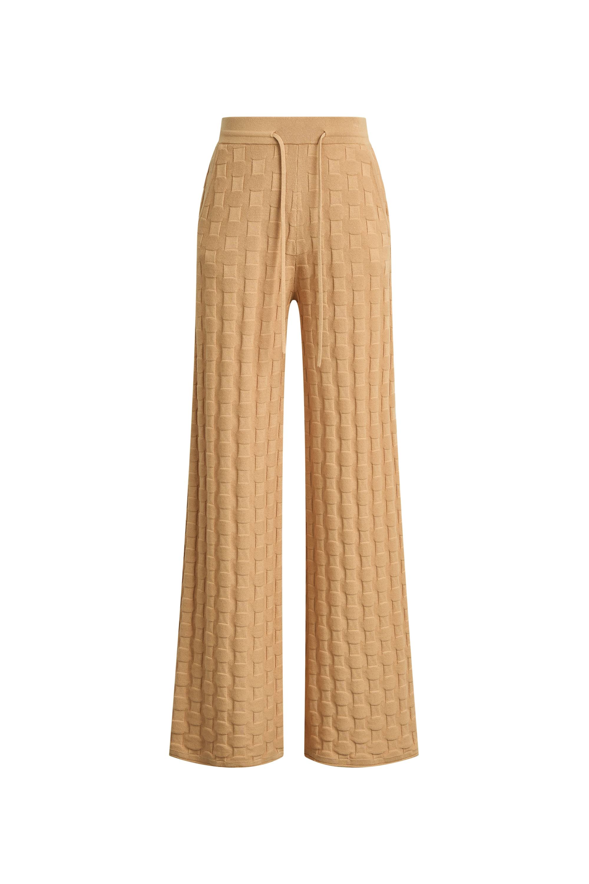 Réimaginé dans un kaki clair, ce pantalon en maille texturée offre une coupe ample à jambes larges pour un confort décontracté sans effort. Le tissage en coton respirant et la taille élastiquée en font un essentiel de haute qualité pour les journées plus chaudes.