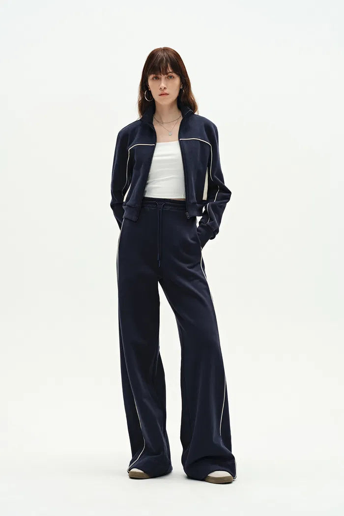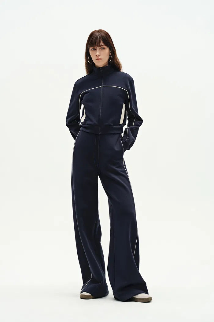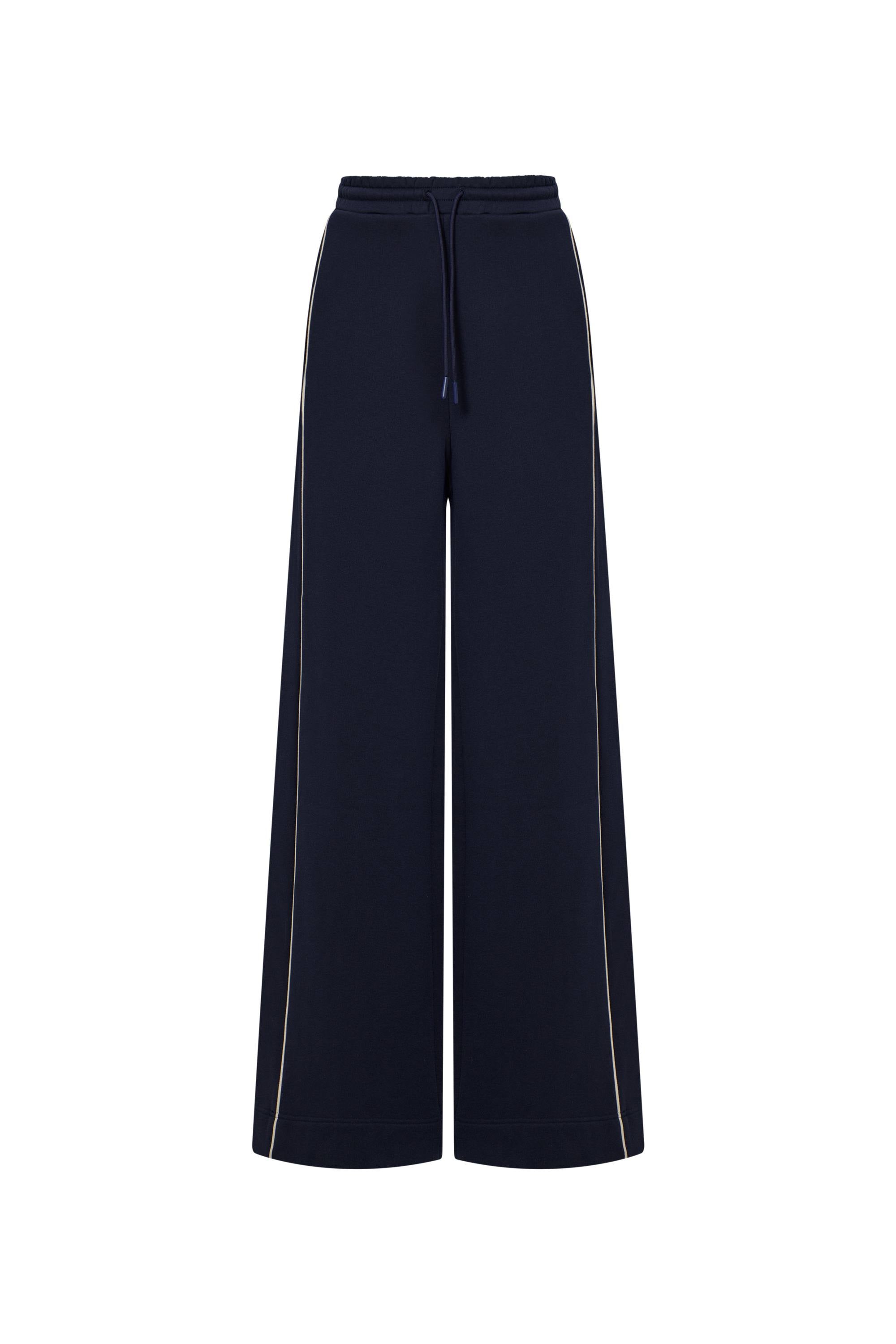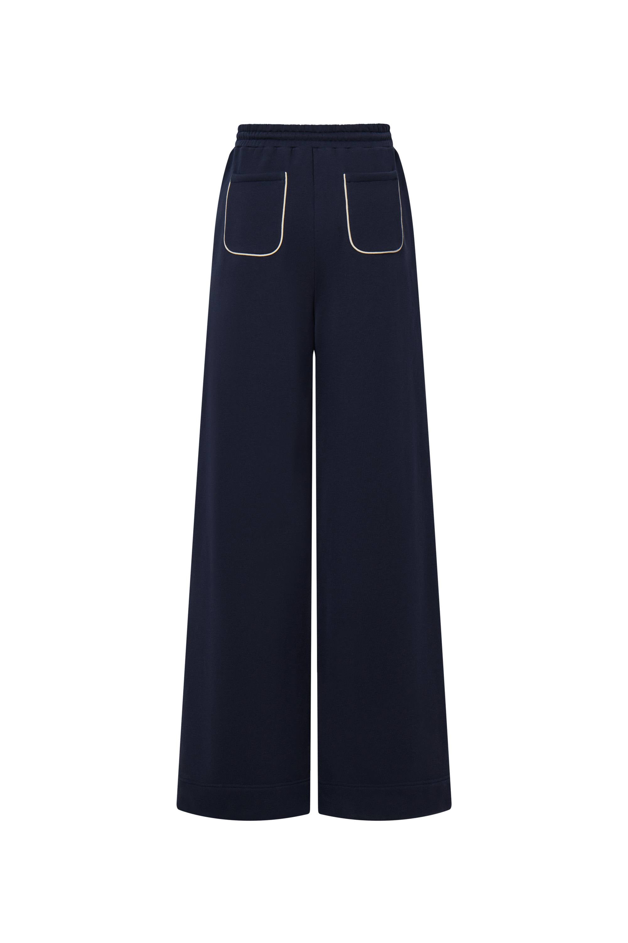 Ces pantalons bleu nuit allient aisance sportive et élégance urbaine. La taille haute et les jambes larges créent des lignes infinies, tandis que les poches cachées et la ceinture stretch confortable rendent chaque mouvement facile.