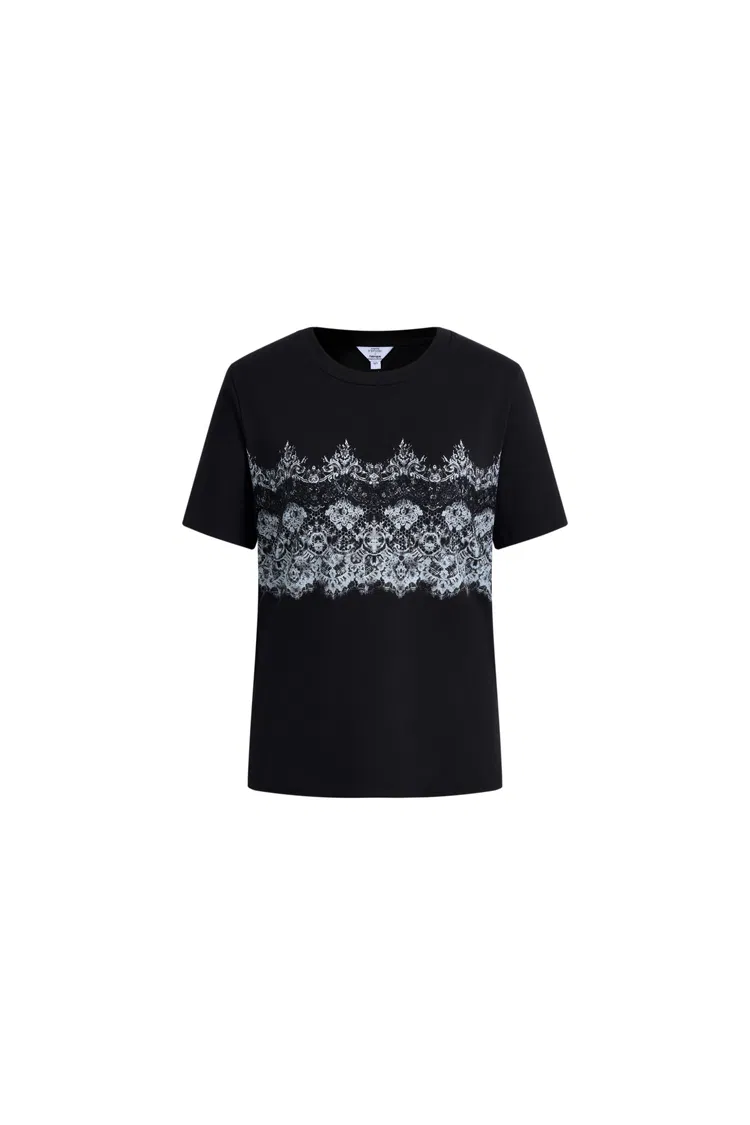 La dentelle inspirée de la couture est réimaginée en une impression semi-graphique sur un t-shirt en coton quotidien. Des bordures brodées sur mesure sont superposées à l'impression pour un effet subtil en 3D. La coupe est nette et ajustée — une nouvelle interprétation d'un classique romantique qui s'intègre parfaitement dans une garde-robe moderne.
