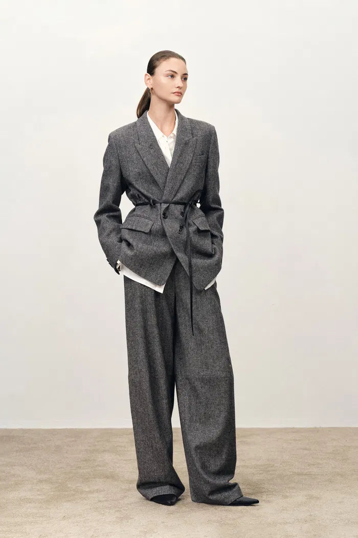 Ce blazer déconstruit le costume traditionnel avec un chevauchement asymétrique de l'ourlet qui élimine la rigidité formelle que la plupart des blazers imposent. Le système à double ceinture s'enroule deux fois autour de votre taille, créant un jeu de proportions dramatique tout en conservant une crédibilité professionnelle.