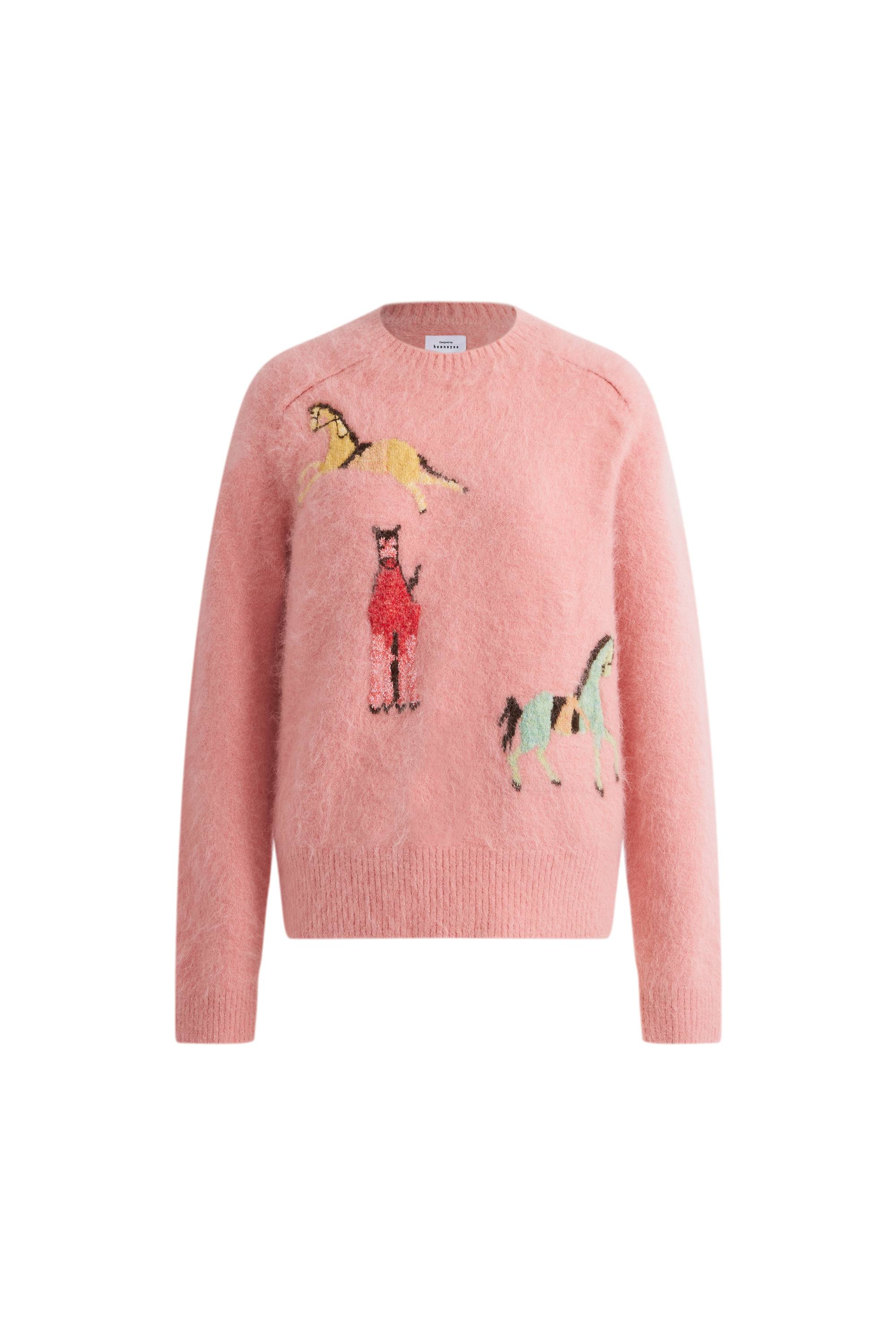 Un pull d'hiver aux tons doux et atténués avec un motif de poney. La palette de couleurs douce garde le design discret tout en ajoutant de la chaleur aux tenues neutres.