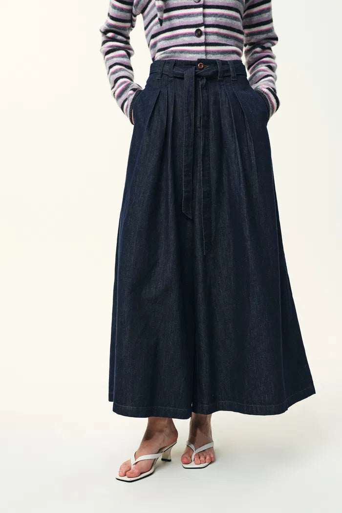 Ces culottes plissées offrent la liberté d’un pantalon avec la grâce d’une jupe. Confectionnées dans un mélange de lin doux en indigo profond, la taille à nouer ajoute une finition superposée et élégante.