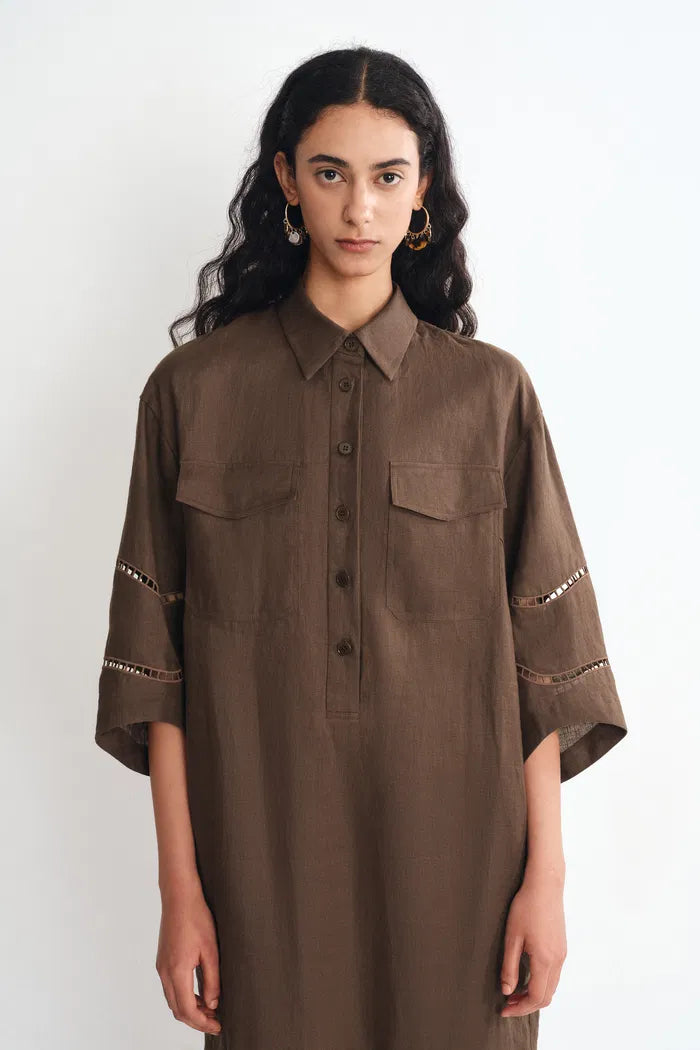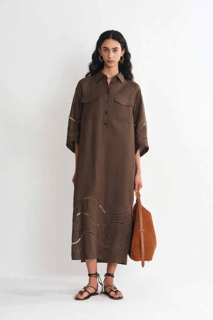 Cette robe Riley apporte une broderie inspirée des vagues à un style décontracté en lin. Les manches courbées évoquent le mouvement de l'océan, tandis que les fentes latérales assurent une marche aisée. En riche brun moka qui s'accorde parfaitement avec tout, des sandales aux bijoux remarquables.