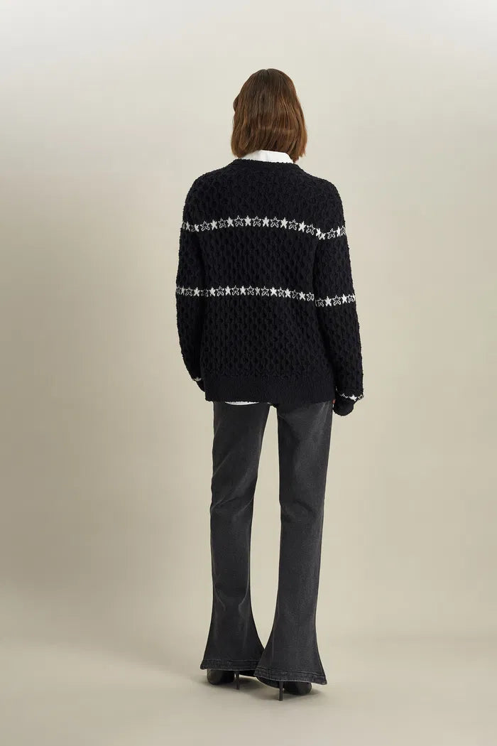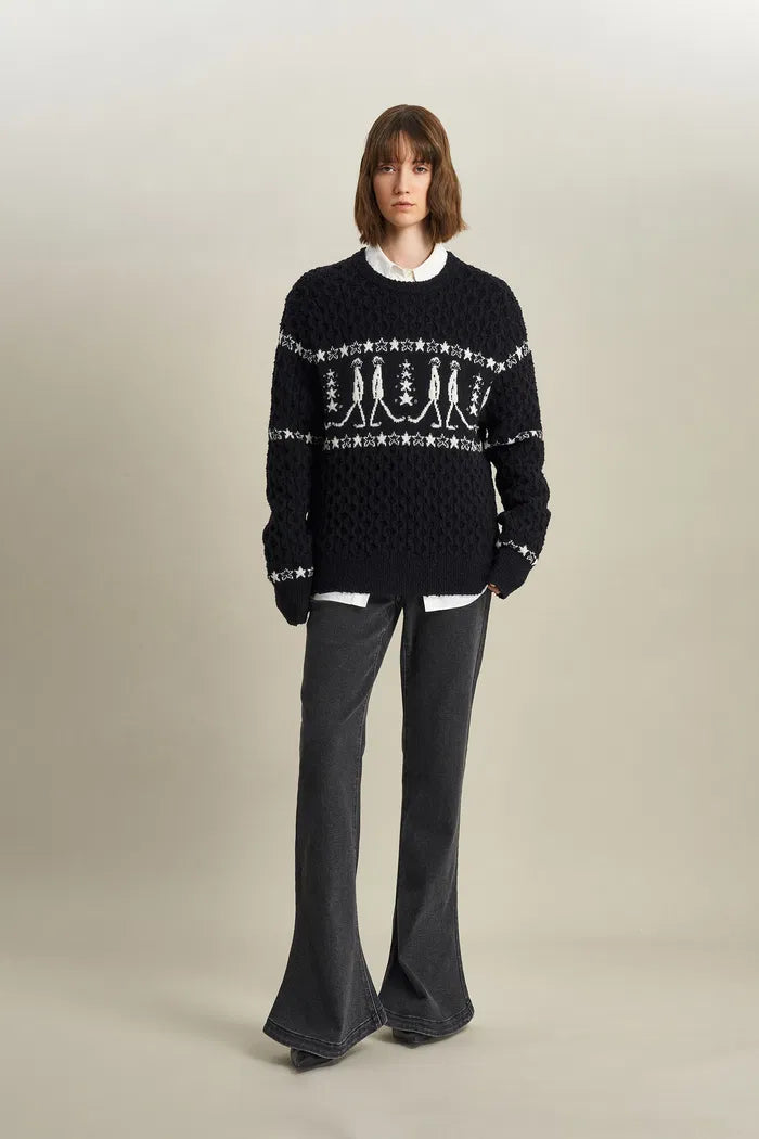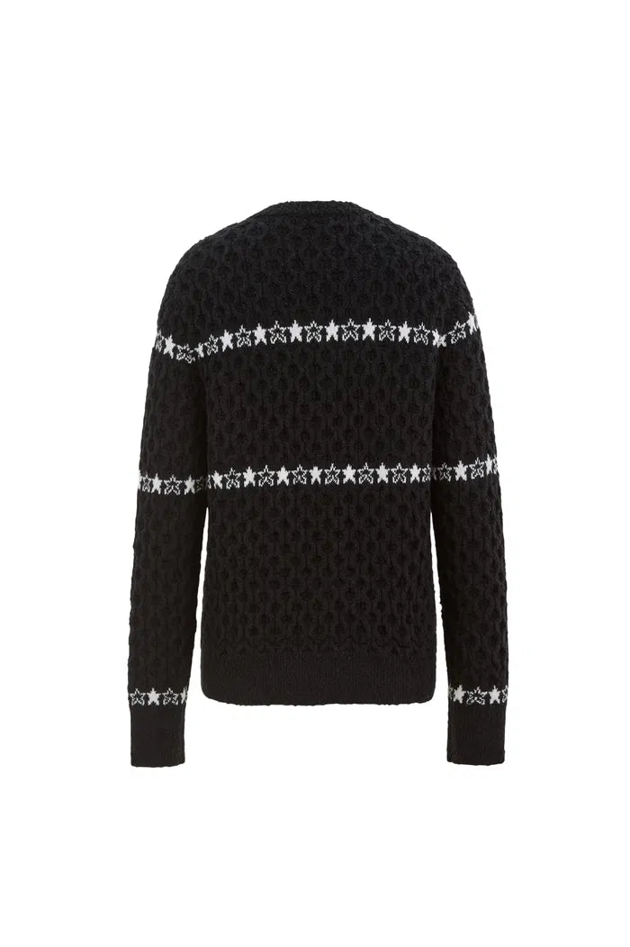 Star Walker Pull Fair Isle noir en laine tricotée avec fil à pompons