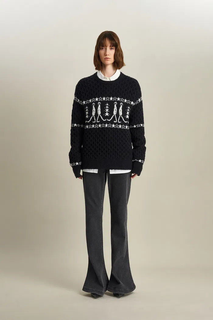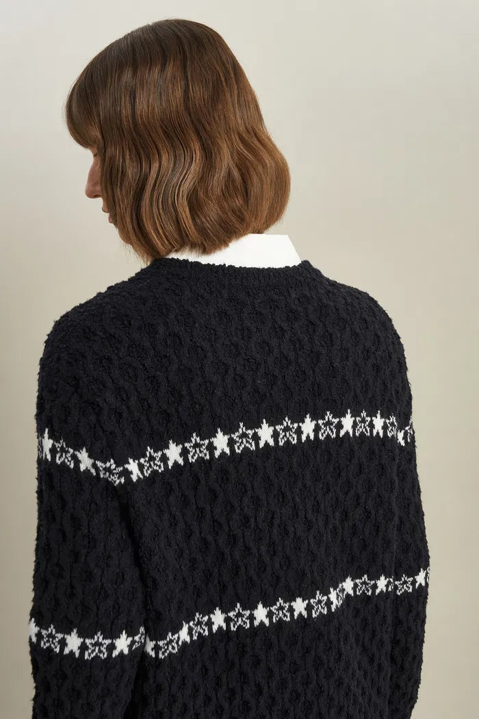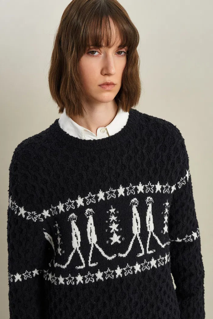 Ce pull marie la tradition Fair Isle avec une touche ludique. Les pompons et les textures en maille torsadée sont intégrés avec soin. Des motifs d'étoiles filantes sont placés stratégiquement pour créer un paysage de rêve à porter.