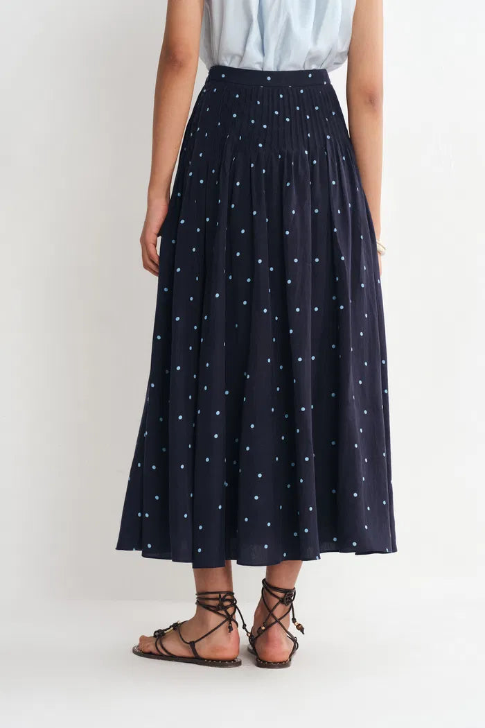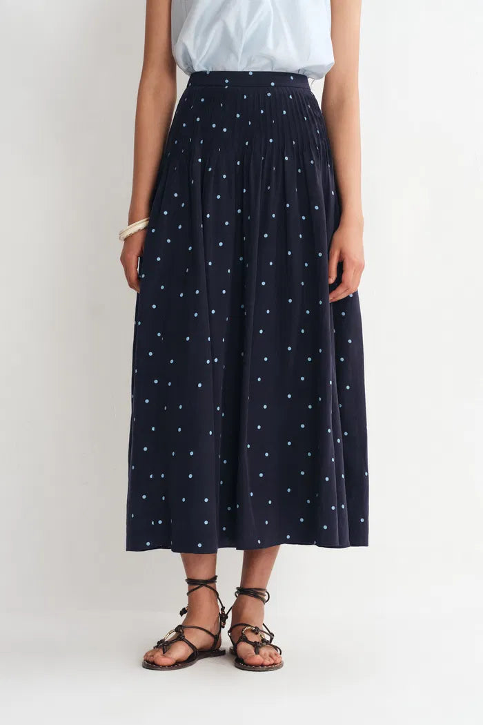 Ce caraco Ellie transforme les pois vintage en quelque chose de frais grâce à un plissage dense et un ourlet légèrement asymétrique. Le décolleté droit met joliment en valeur les clavicules, tandis que les boutons recouverts de tissu ajoutent un détail personnalisé. En lin respirant qui s’améliore à chaque lavage. Cette jupe Nora associe des plis serrés à un ourlet ample et fluide. Le fond marine avec des pois bleu clair crée un charme vintage aux proportions modernes. Le mélange de lin garde sa forme tout en restant respirant—votre nouveau favori pour les occasions décontractées comme habillées.