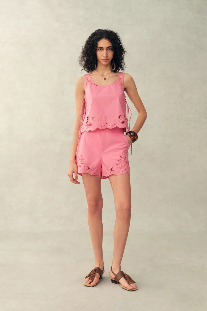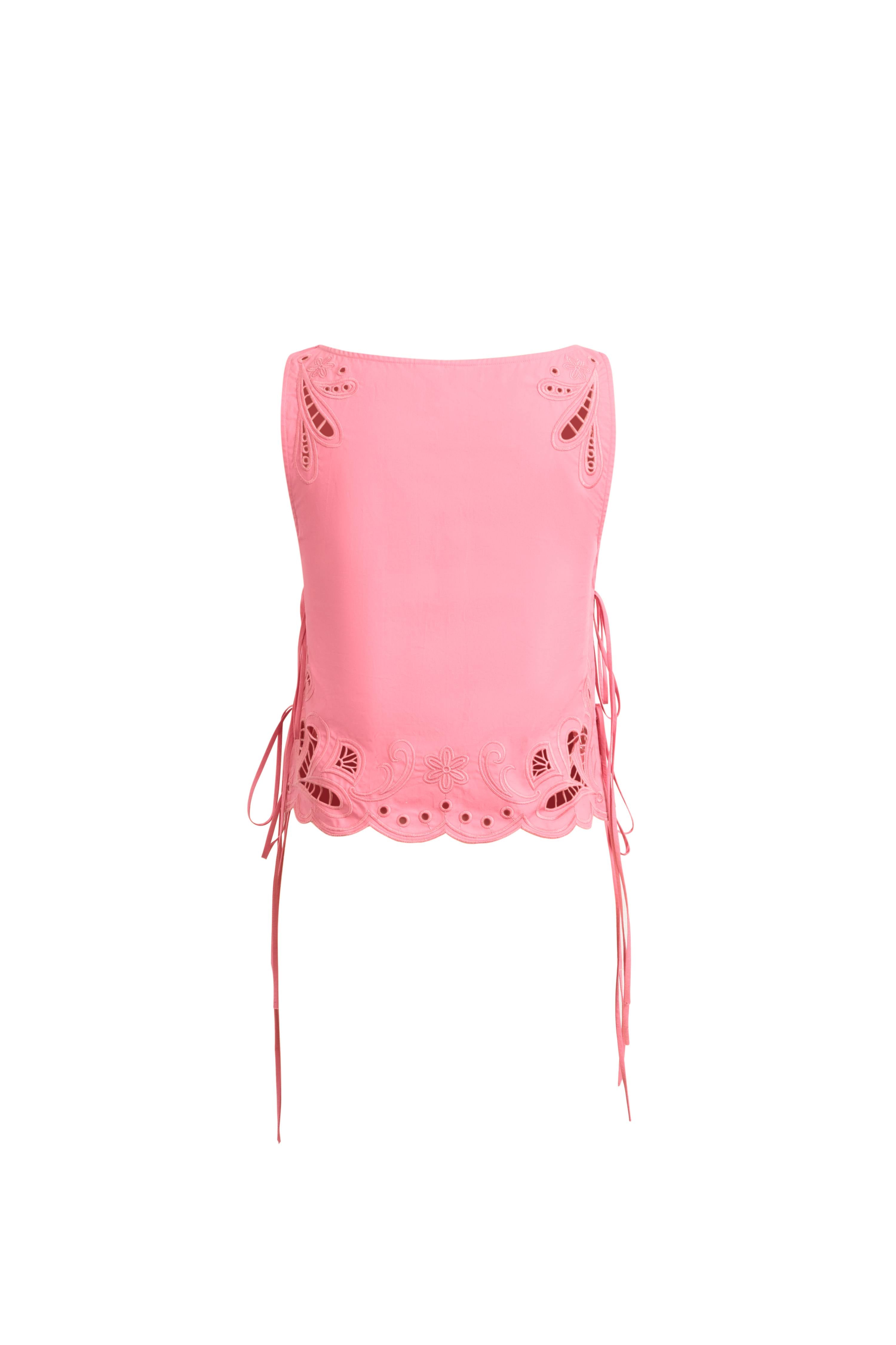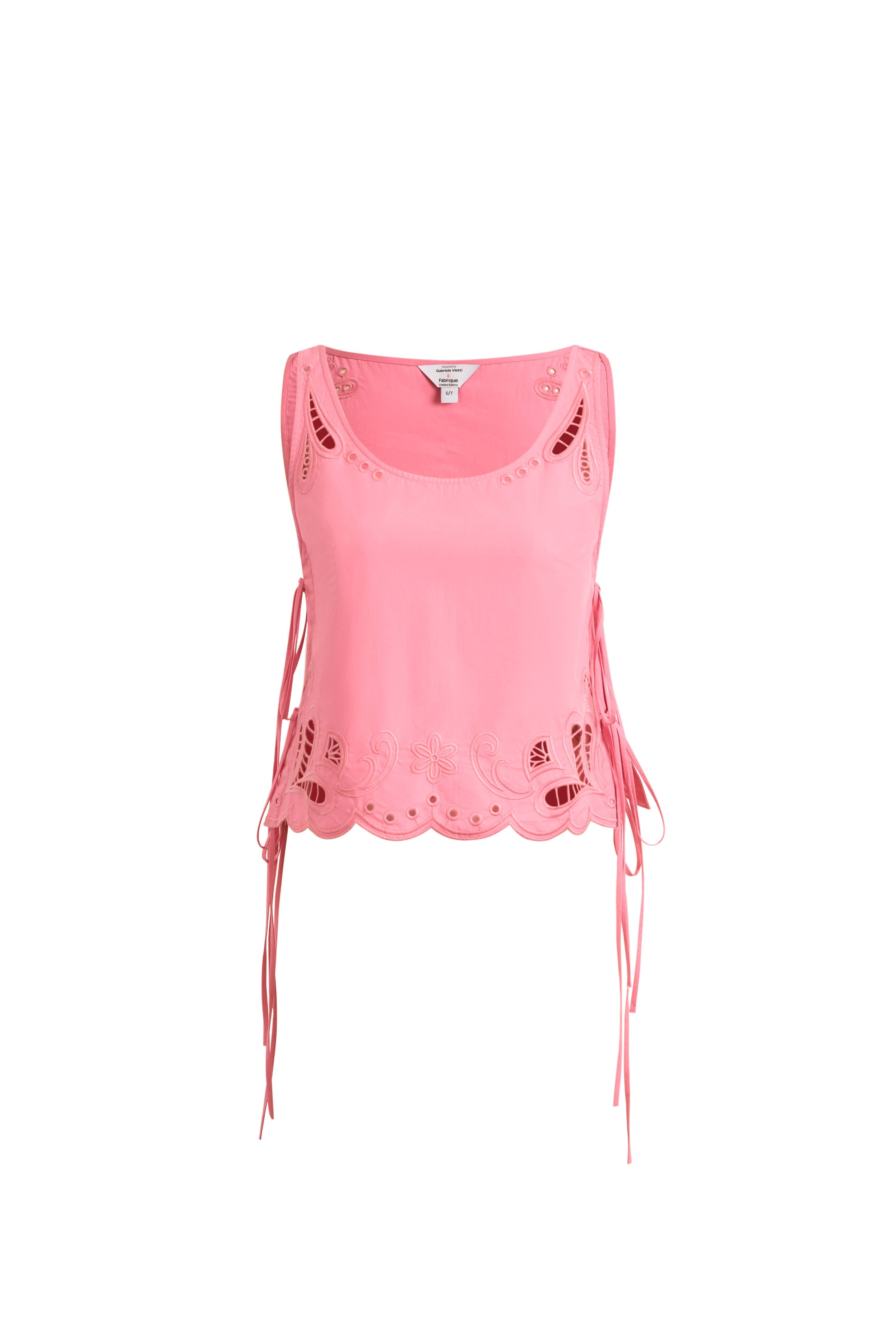 Ce débardeur court présente des liens latéraux ajustables et une délicate broderie œillet cachemire. Le tissu popeline structuré et la coupe respirante équilibrent un look ludique, prêt pour les vacances, avec la qualité durable d'un basique de garde-robe.