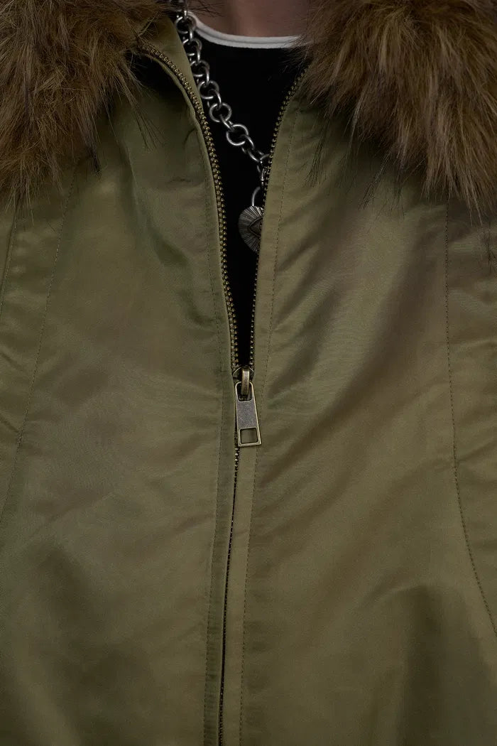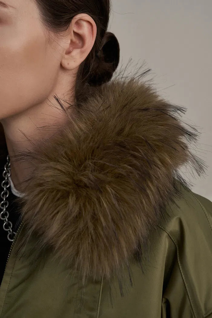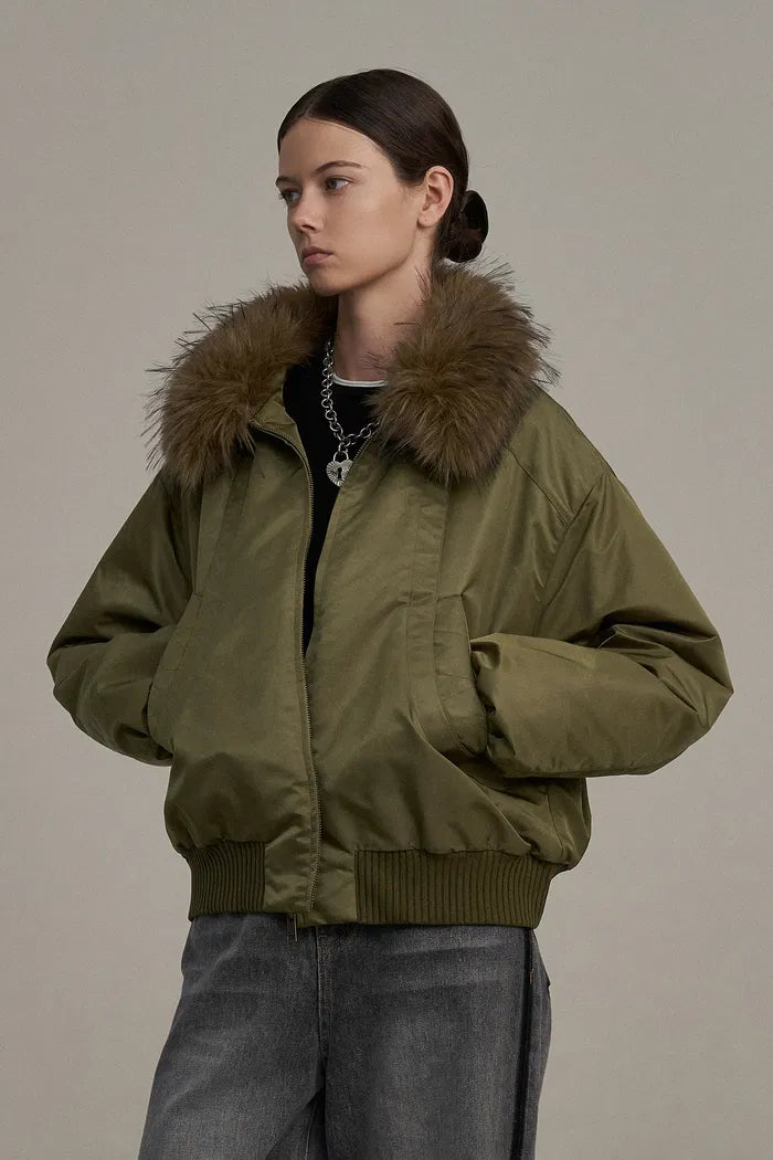 Cette veste allie style pilote et confort douillet. Nylon déperlant associé à 90 % de duvet de canard blanc. Un col en fausse fourrure apporte une chaleur luxueuse. La couleur vert militaire renforce son attrait classique.