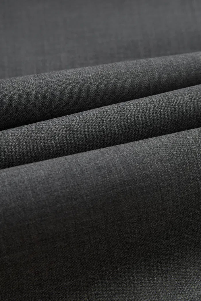 Tissu classique pour costume. Texture lisse et nette. Léger mais structuré pour une silhouette 3D. Gris chiné subtil pour une sophistication intellectuelle.