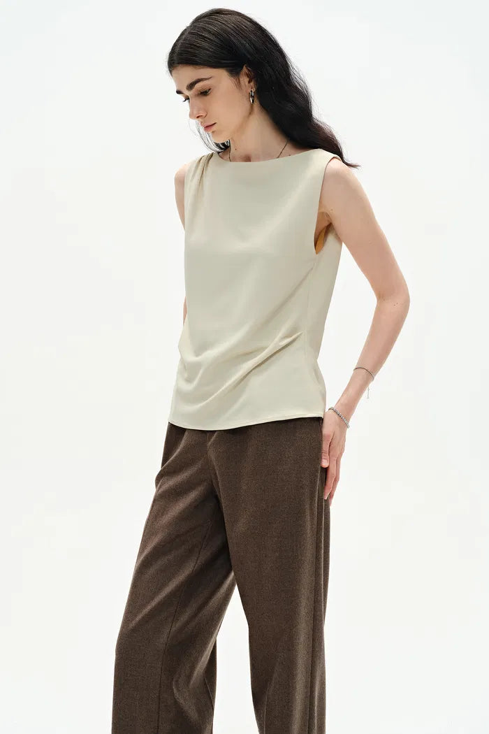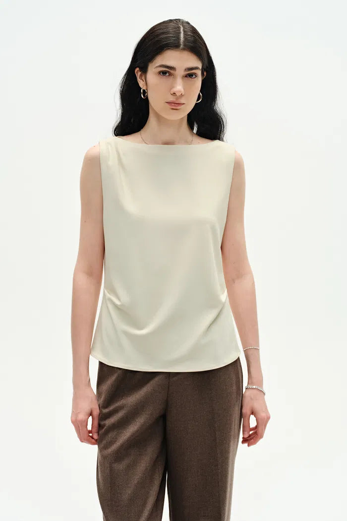 Laissez notre haut sans manches redéfinir l'élégance par temps chaud. Des plis soignés aux épaules et à la taille apportent de la structure au tissu extensible. En blanc chaud, c'est votre nouveau favori pour un look soigné, sans effort.