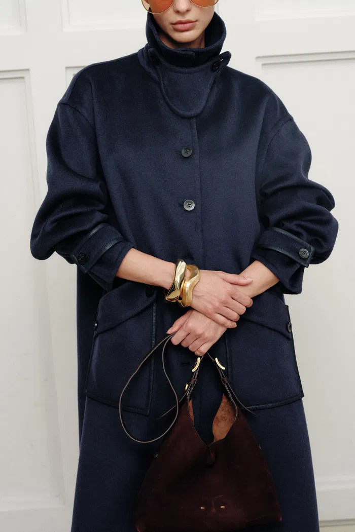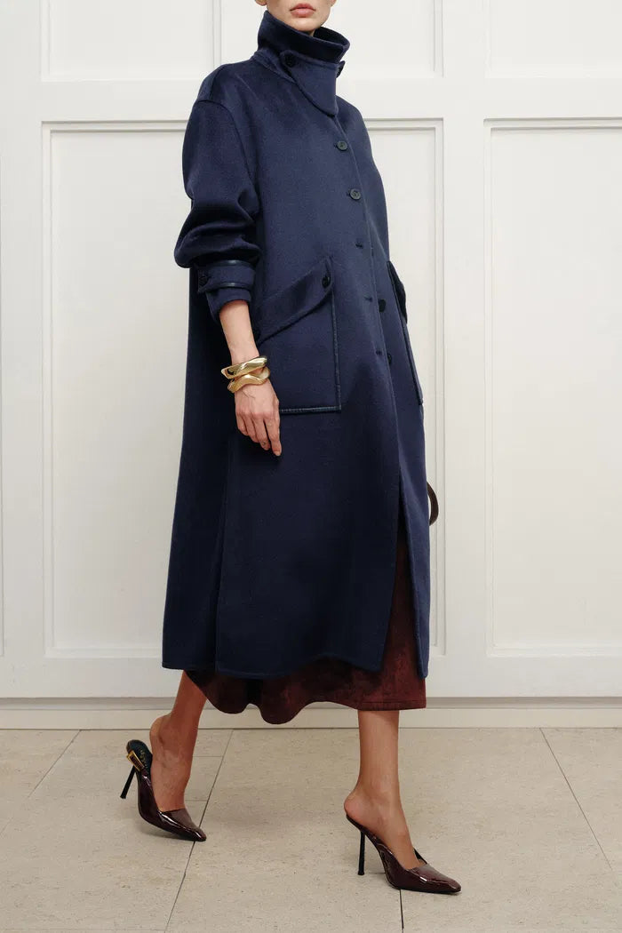Manteau Theo bleu nuit à bordures en double-face mérinos-cachemire