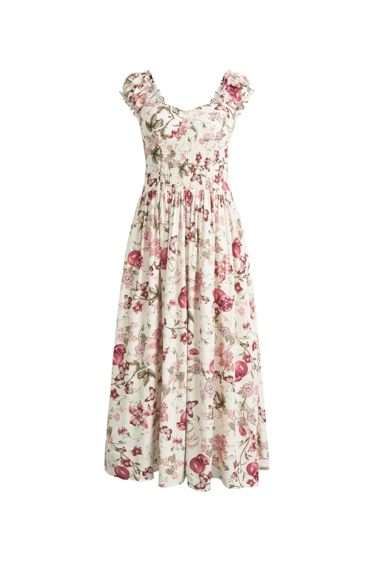 Cette robe à bretelles en mélange de lin apporte une touche fraîche à la robe d'été inspirée du corset, avec un imprimé grenade dessiné à la main et un smockage intégral pour un ajustement plus flexible. Le rembourrage intégré et les poches cachées en font une pièce fiable pour les occasions printanières.
