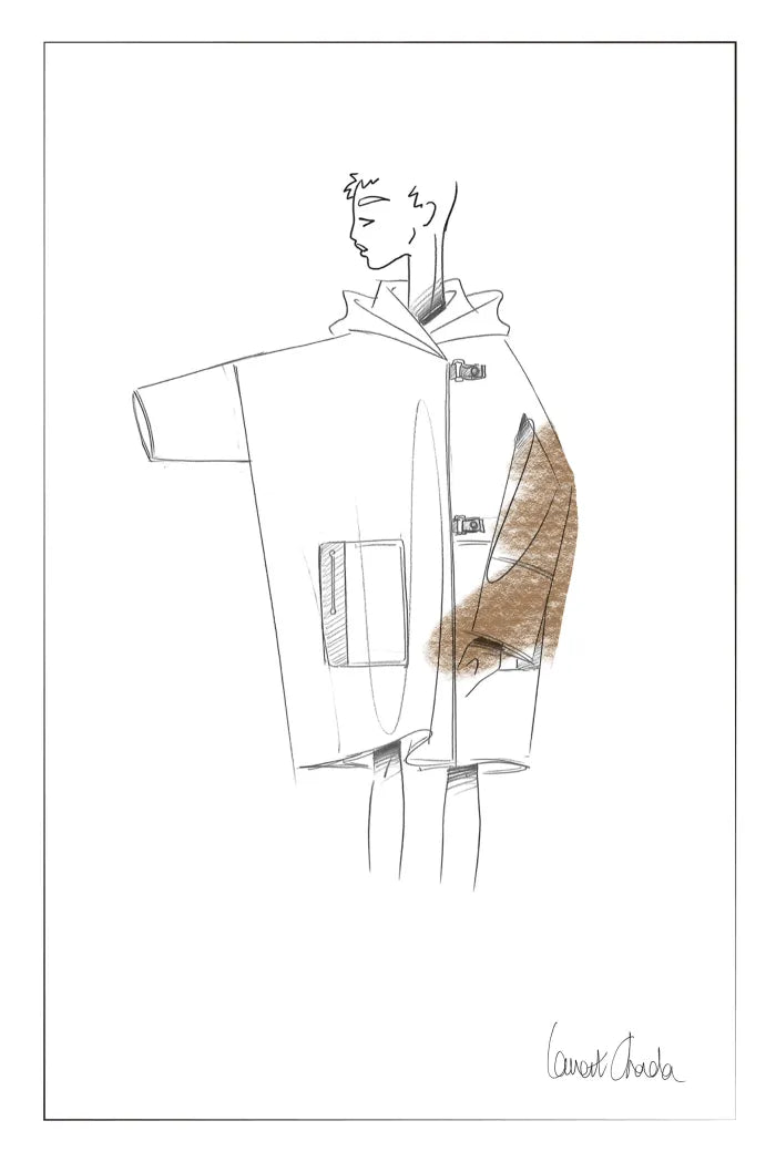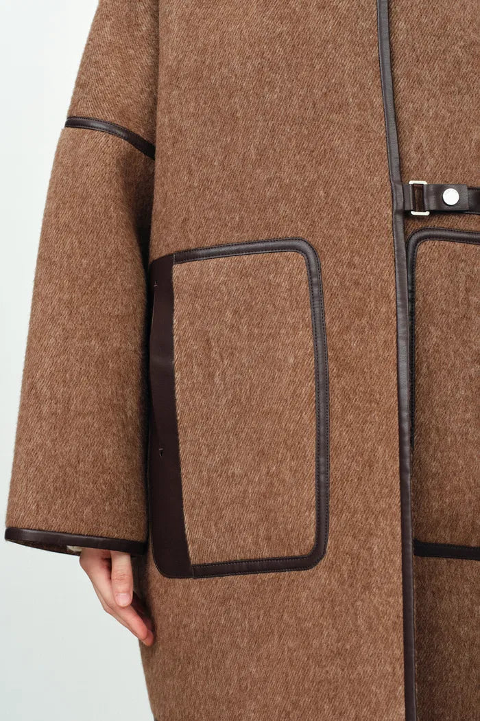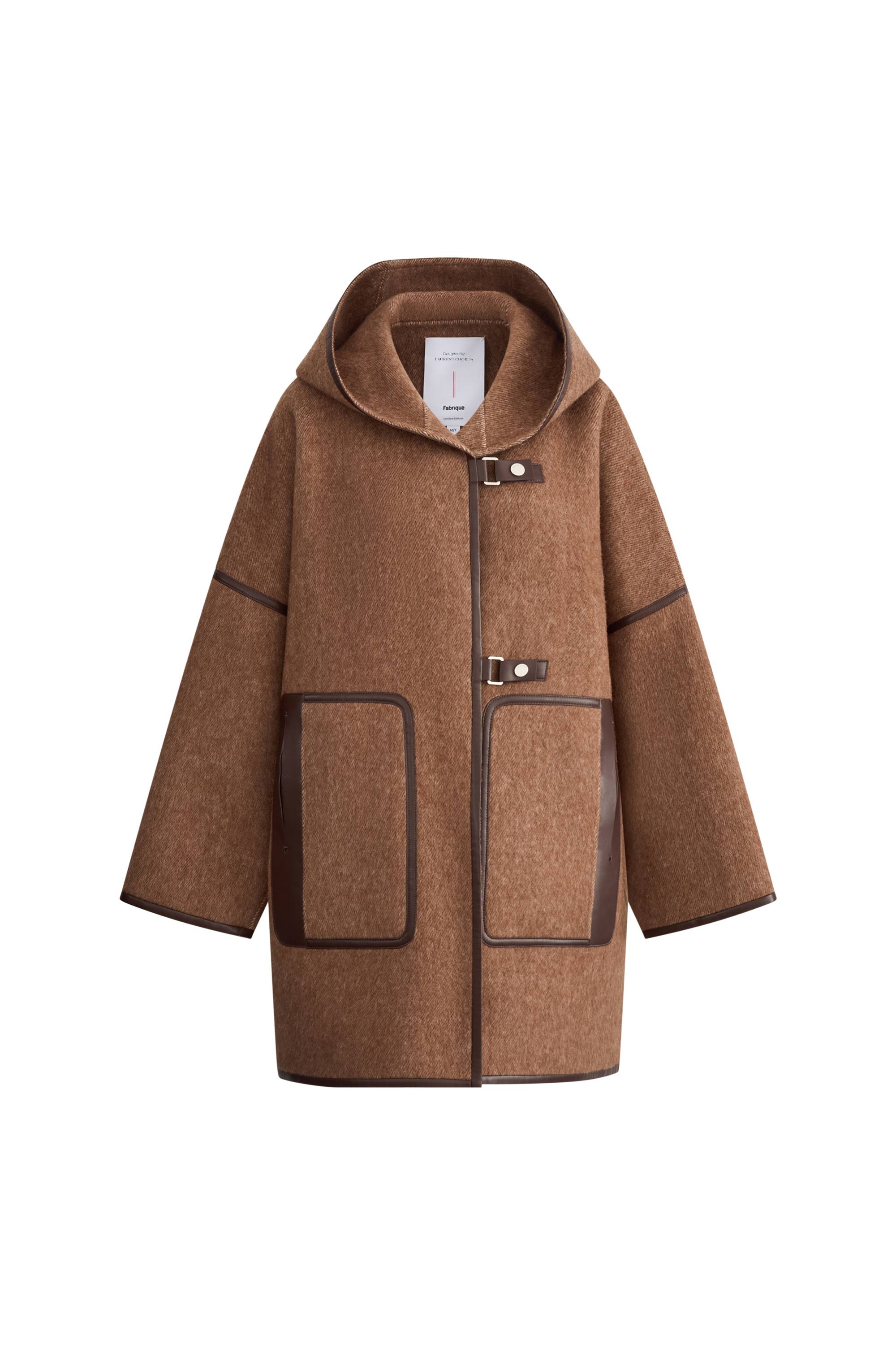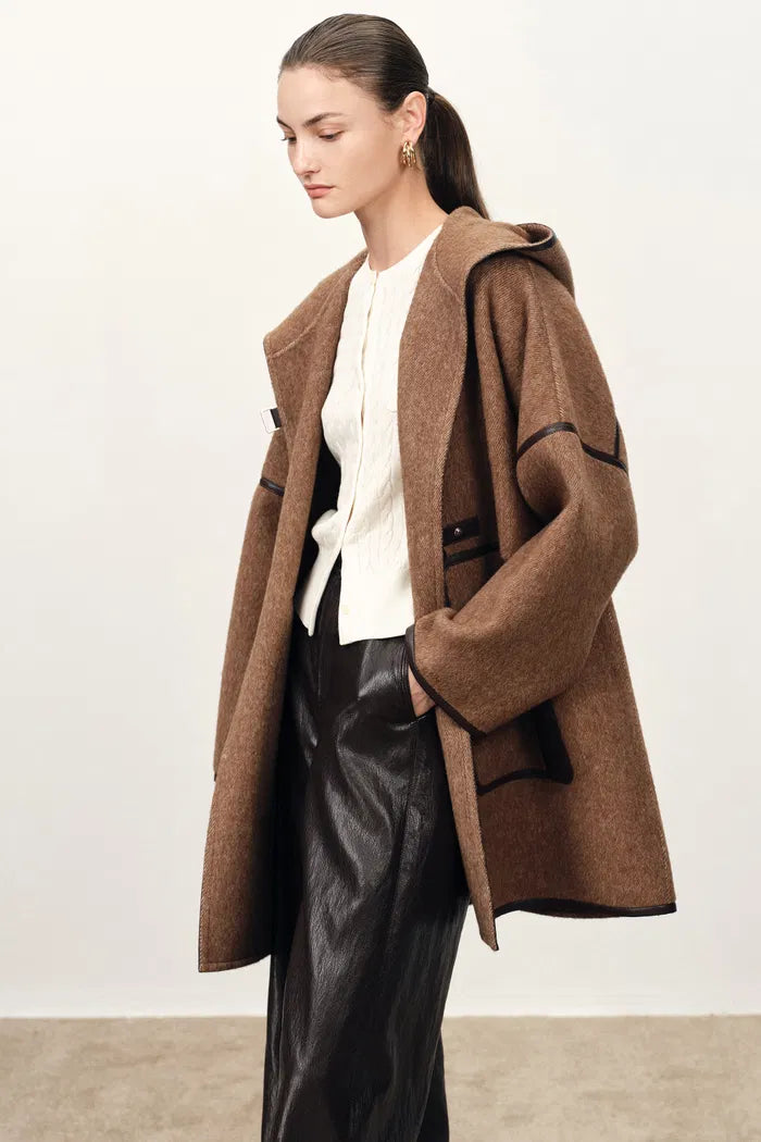 Un cappuccio generoso cambia l’atmosfera qui—pratico ma rilassato, con rifiniture in pelle per un tocco elegante. Il tessuto in lana a pelo strutturato ha quella sensazione morbida e accogliente che si trova nei cappotti ben fatti.