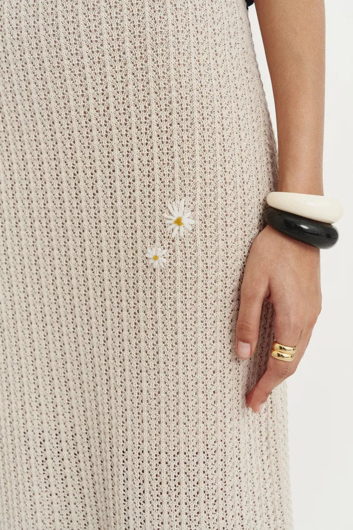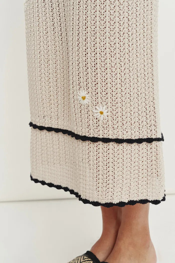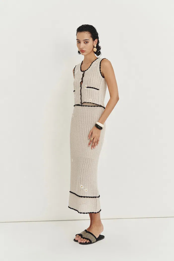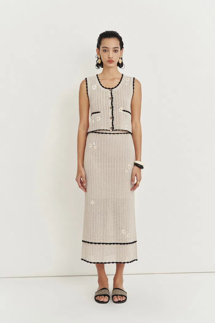 La tua via facile al fascino estivo. Questo completo all'uncinetto abbina un gilet con applicazioni di margherite a una gonna midi valorizzante, entrambi realizzati con la nostra miscela di cotone e lino. I bordi rifiniti a conchiglia e i bottoni di cocco aggiungono dettagli da isola, mentre la vita elastica e la fodera morbida lo rendono un capo comodo per tutti i giorni.