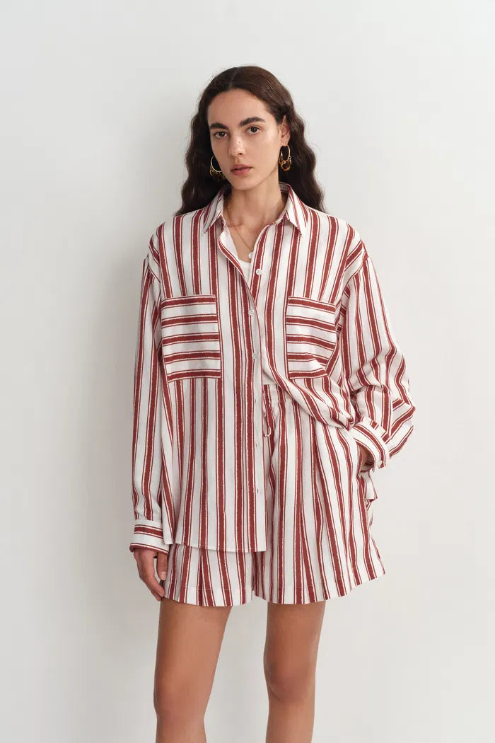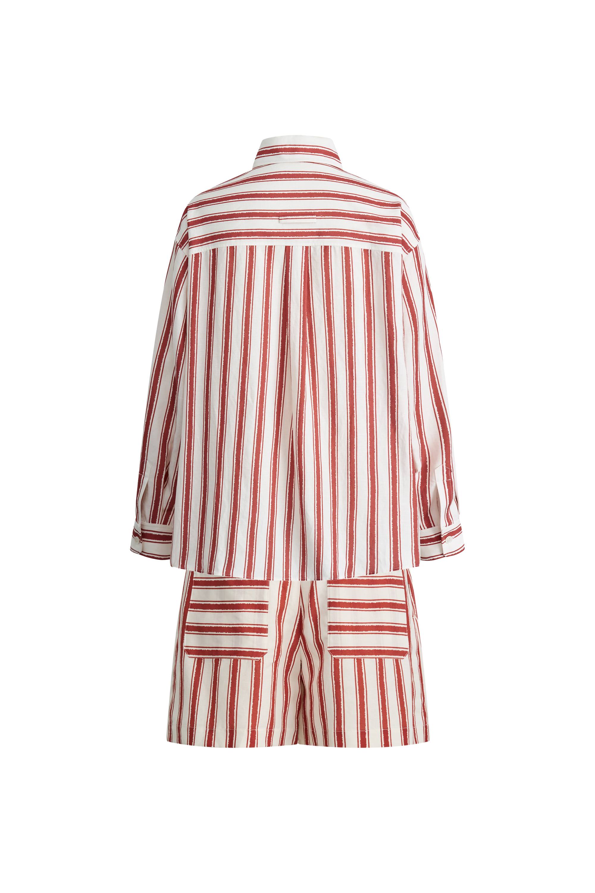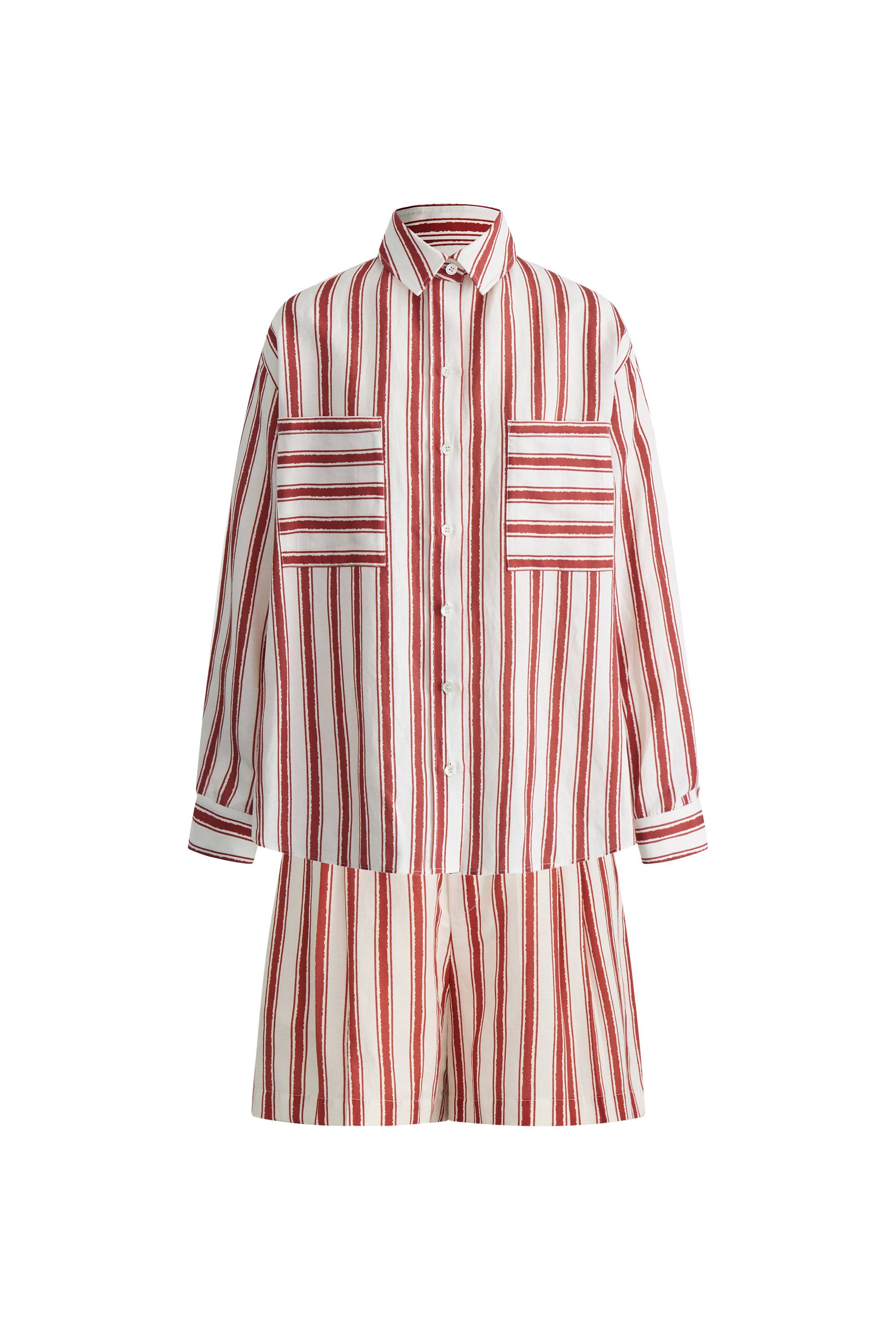 Le righe rosse assumono una qualità artistica in questo completo casual. Linee audaci simili a pennellate danno al lino classico un tocco moderno, mentre le tasche posizionate con cura creano interesse con la direzione delle righe a contrasto. La scollatura quadrata e le maniche rilassate lo rendono il tuo nuovo must-have per il weekend.