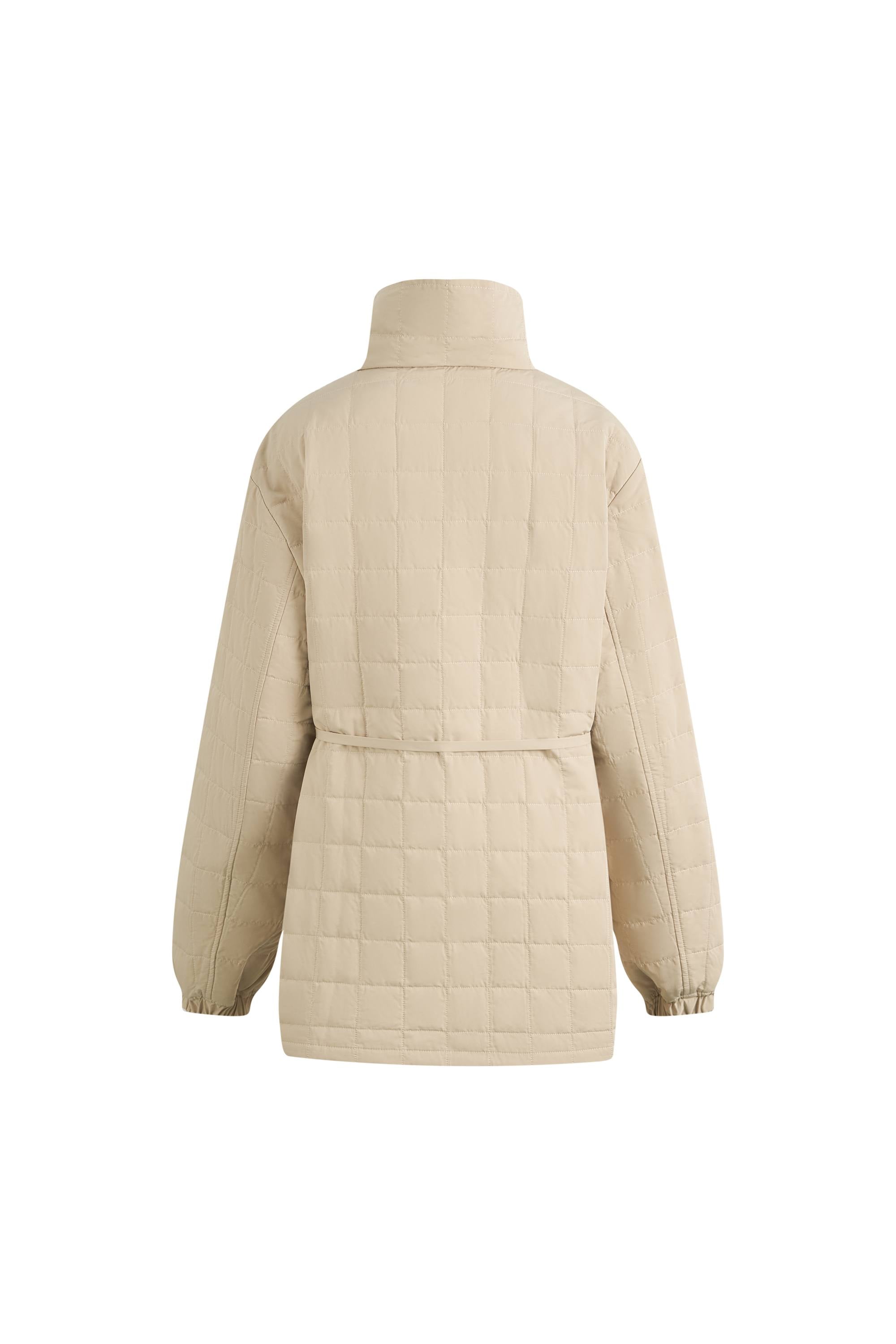Tessuto denso mantiene la piuma d’anatra esattamente dove deve essere grazie a una trapuntatura quadrata ordinata e bottoni dorati che richiamano l’eleganza della campagna inglese. Colletto alla coreana e cintura proteggono dal vento mantenendo la silhouette abbastanza leggera per essere stratificata.