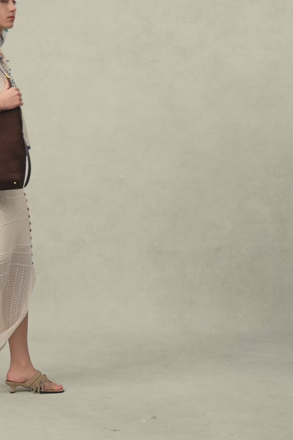 Catturando la leggerezza del Mediterraneo, questo completo presenta una maglia con colletto nautico e rifiniture a contrasto e una gonna con spacco laterale. Il design con laccio frontale e la trama a uncinetto traspirante lo rendono un capo estivo versatile e chic.