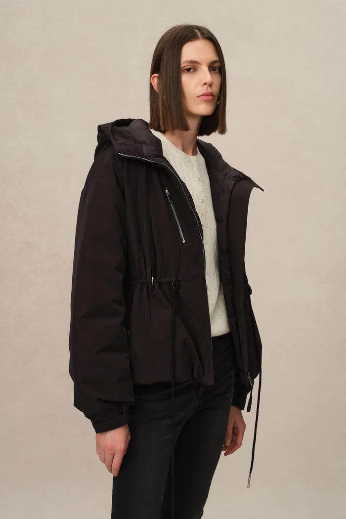 Tessuto high-tech ecologico. Leggero, leggermente elastico, a bassa carica elettrostatica, resistente alle pieghe. Sensazione simile al cotone. Tecnologia brevettata anti-piumino. Traspirante, termoregolatore. Resistente agli strappi, anti-piumino, idrorepellente. Nero profondo per un'eleganza senza tempo.