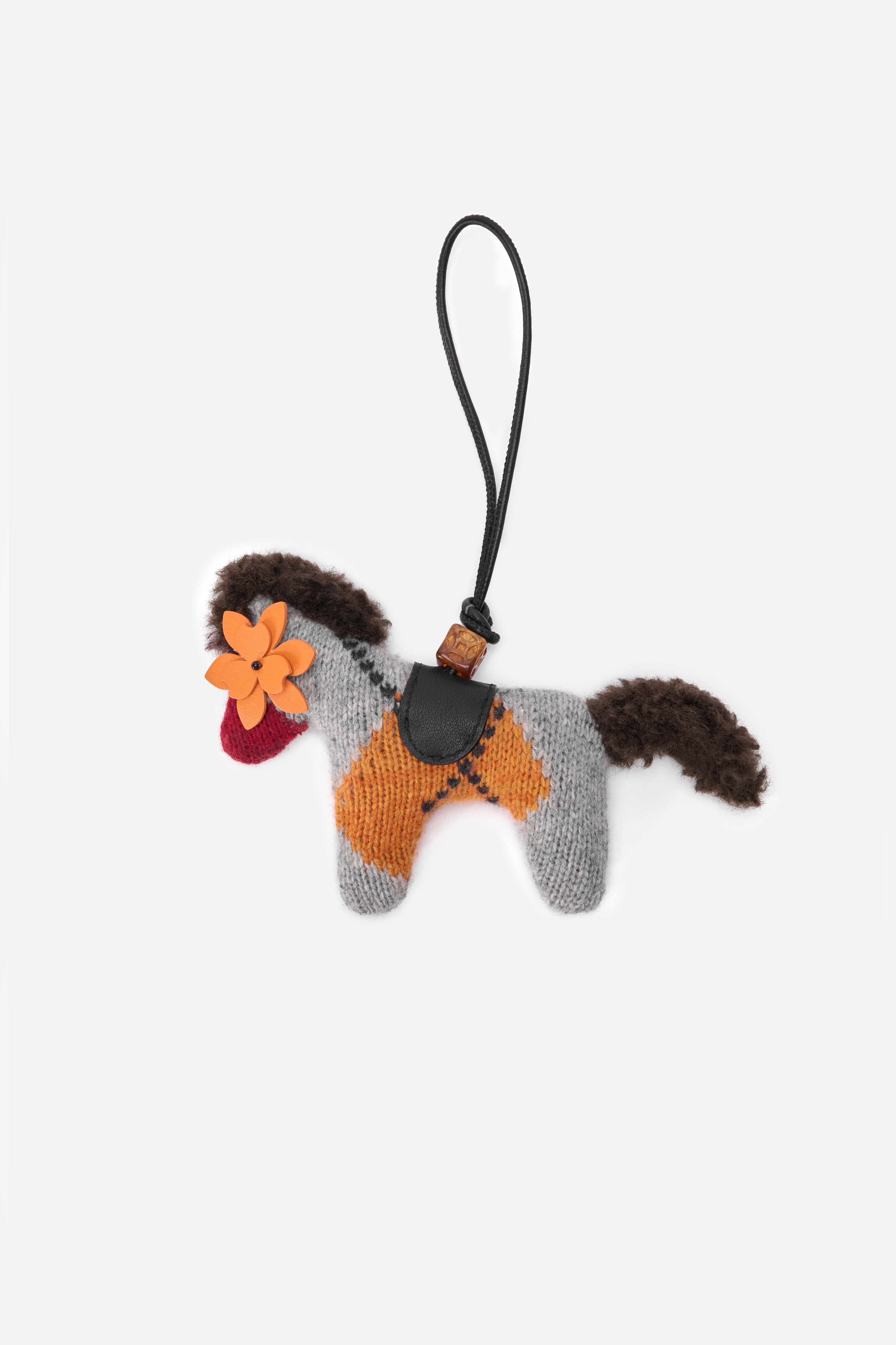 Questo charm per borsa a forma di pony lavorato a maglia porta un tocco giocoso di motivo scozzese britannico in un accessorio morbido e pronto per l'inverno. La base grigio chiaro melange è ravvivata da un contrasto audace arancione dorato, mentre la criniera e la coda soffici aggiungono una texture che si può davvero sentire. Rifinito con un fiore in pelle sul davanti e un retro più pulito e minimalista.