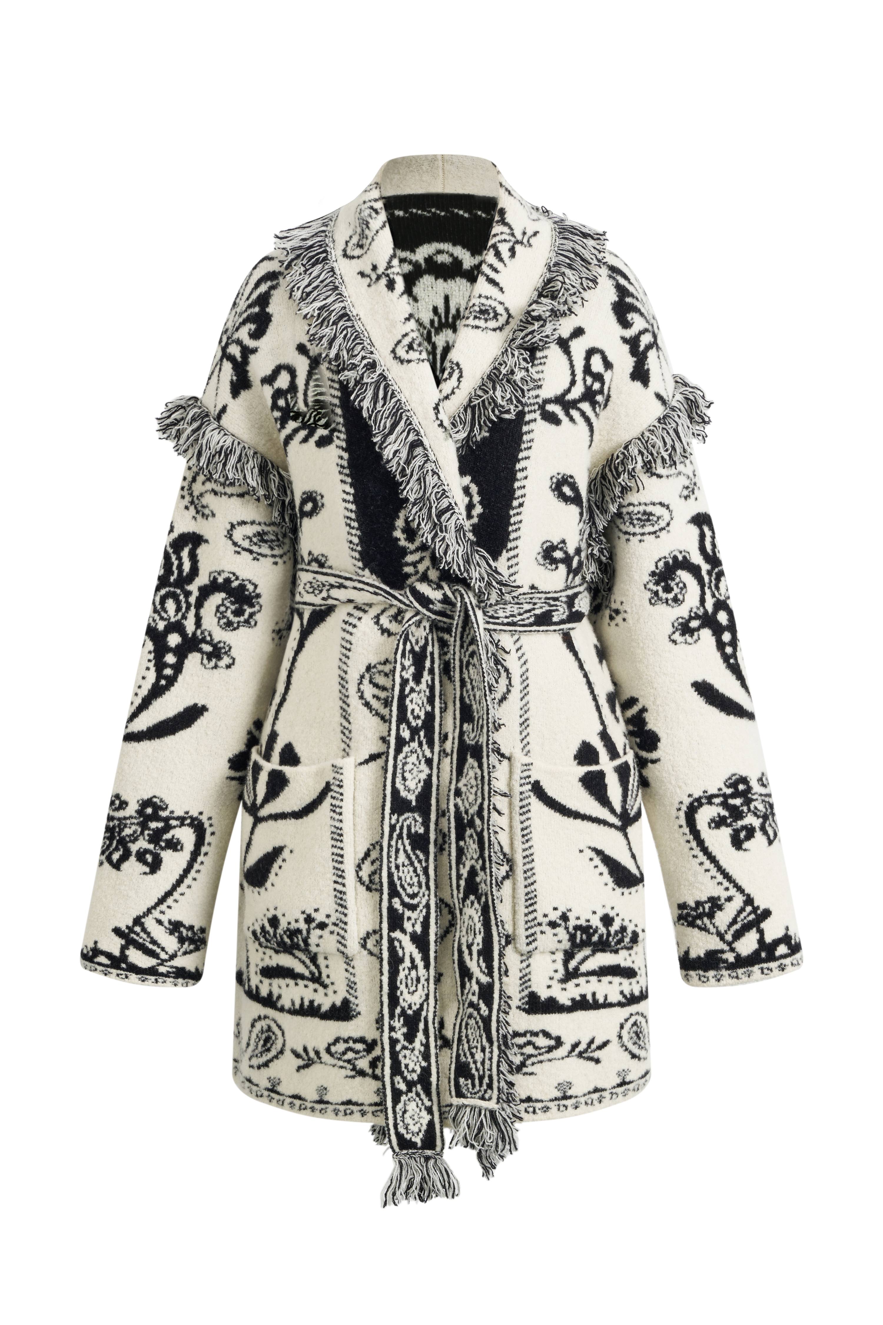 Un cardigan jacquard ricco di dettagli paisley e profondità tattile. Fili morbidi che imitano i tappeti persiani, completo di vita con cintura e design reversibile bianco e nero per cambi d'umore facili.