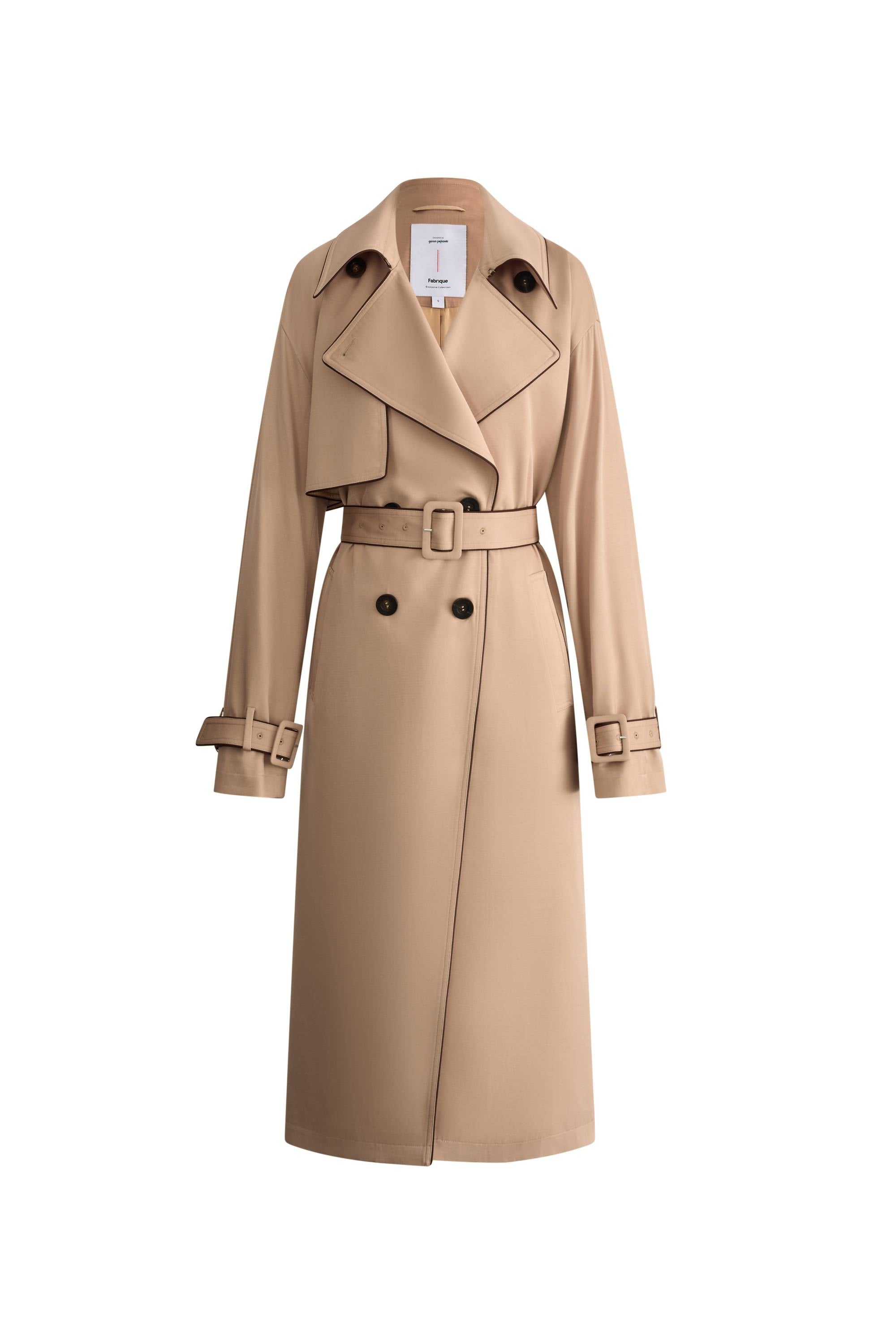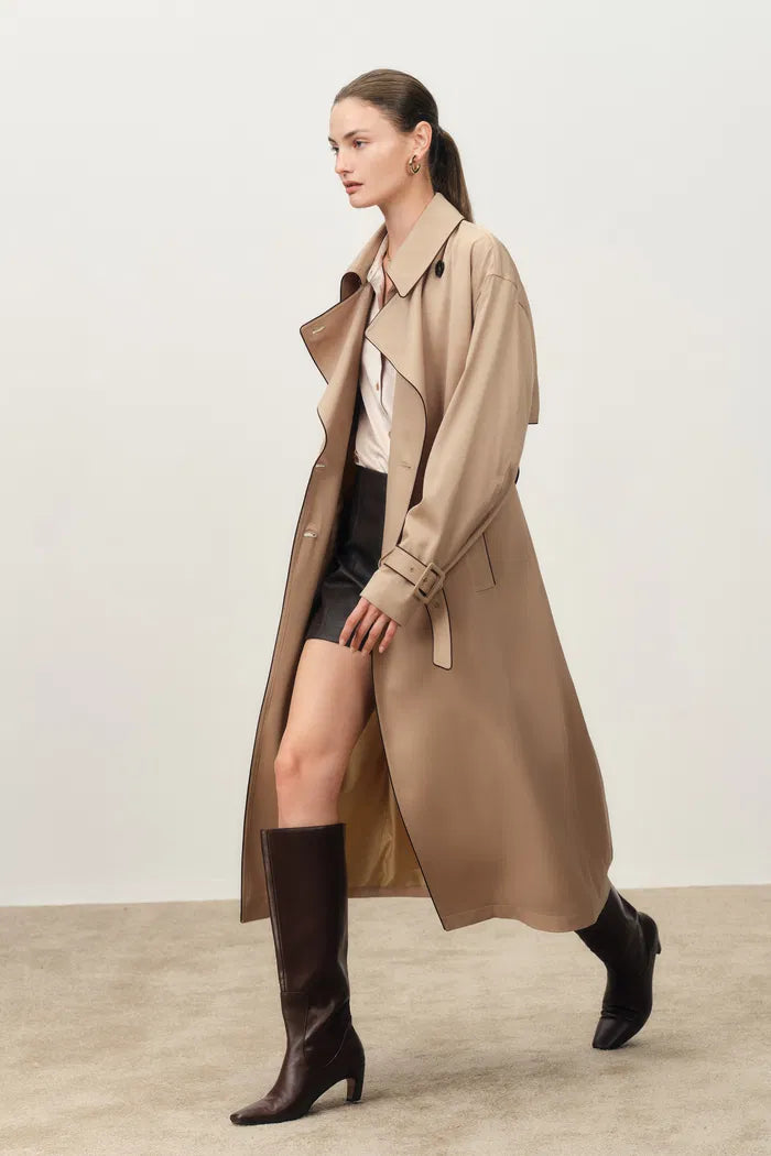 Questo trench elimina le spalline per una linea più morbida e rilassata. Le ampie rever modernizzano la silhouette, un davanti doppiopetto convertibile aggiunge versatilità, e il piping a contrasto definisce il trench con linee nette e pulite