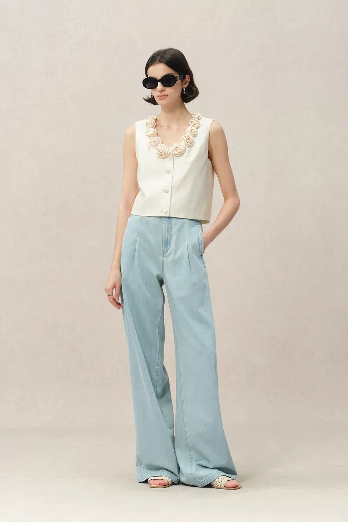 Ecco il denim a vita alta che scivola come seta. La nostra miscela di Lyocell significa nessuna rigidità, mentre la posizione intelligente delle cuciture crea gambe infinite. Quelle pieghe frontali? Sono la tua arma segreta.