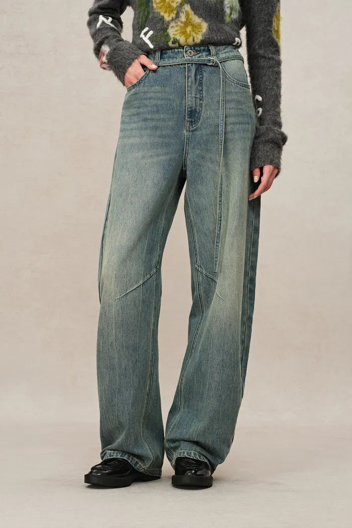Il denim diventa drammatico con questi jeans a gamba larga. La costruzione con cuciture curve crea una silhouette unica che valorizza ogni tipo di corpo. Un lavaggio vintage aggiunge carattere, mentre la vita alta mantiene uno stile moderno.