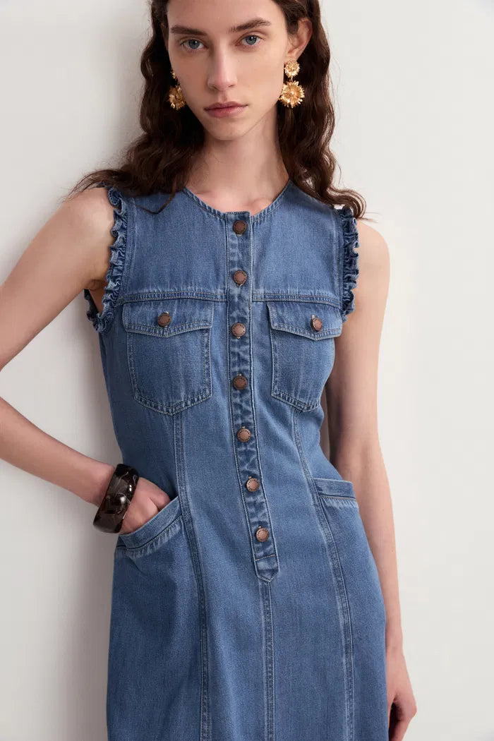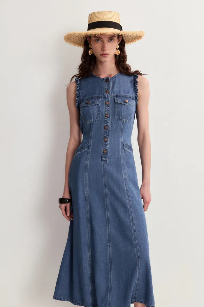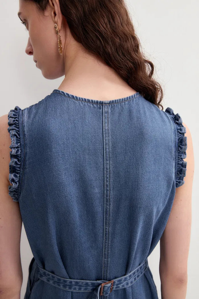 Amelia Schulpjes Geknoopte Getailleerde Midi Jurk in Katoen Linnen Denim