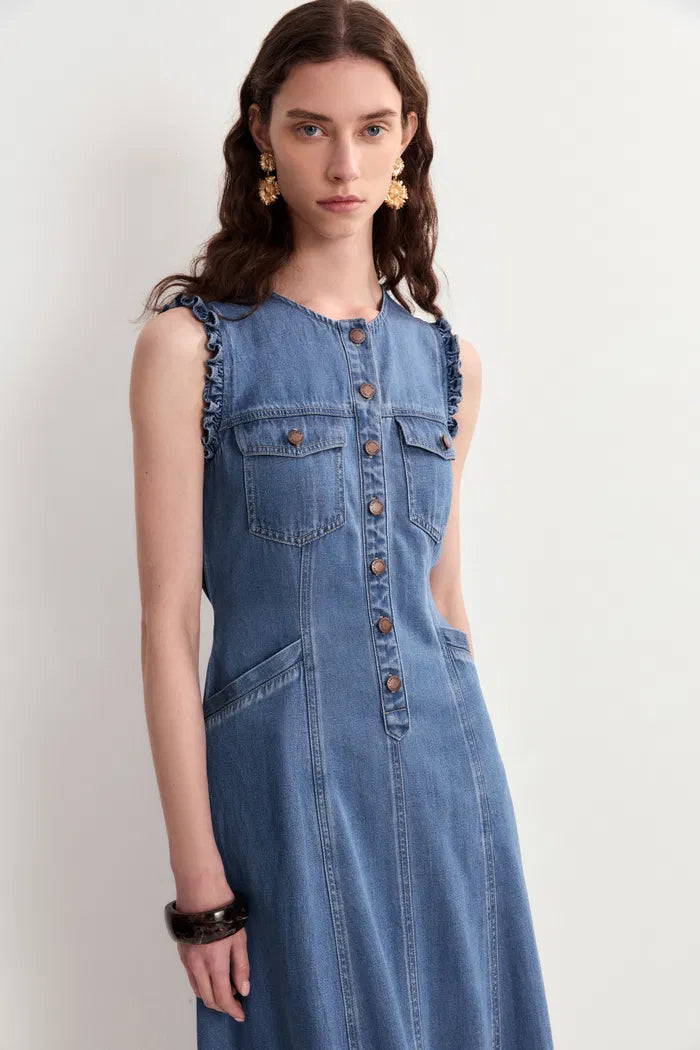 Deze denim jurk tilt basic naar briljant met slimme details die je echt gebruikt. De getailleerde taille flatteert terwijl praktische zakken essentials dichtbij houden.