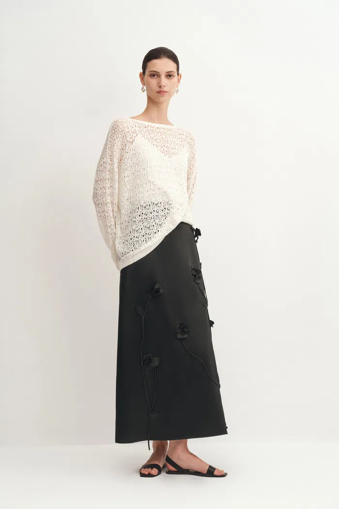 Deze taillehoge rok brengt door de tuin geïnspireerde elementen naar de dagelijkse kleding. Zes met de hand gemaakte bloemen zorgen voor textuur, terwijl de A-lijn snit verschillende figuren flatteert. Zijde-wol satijn voelt stevig maar vloeiend aan.
