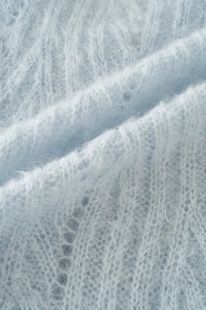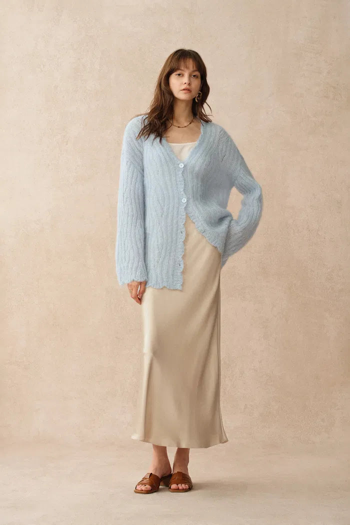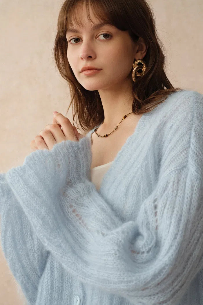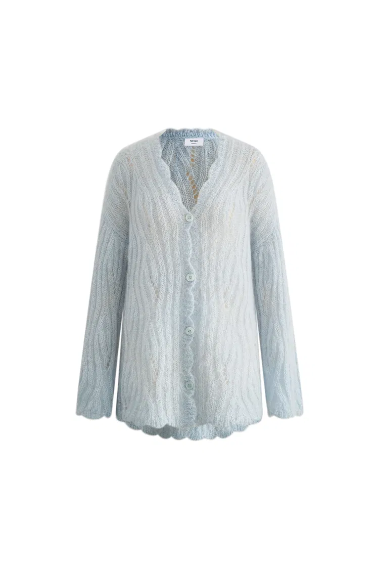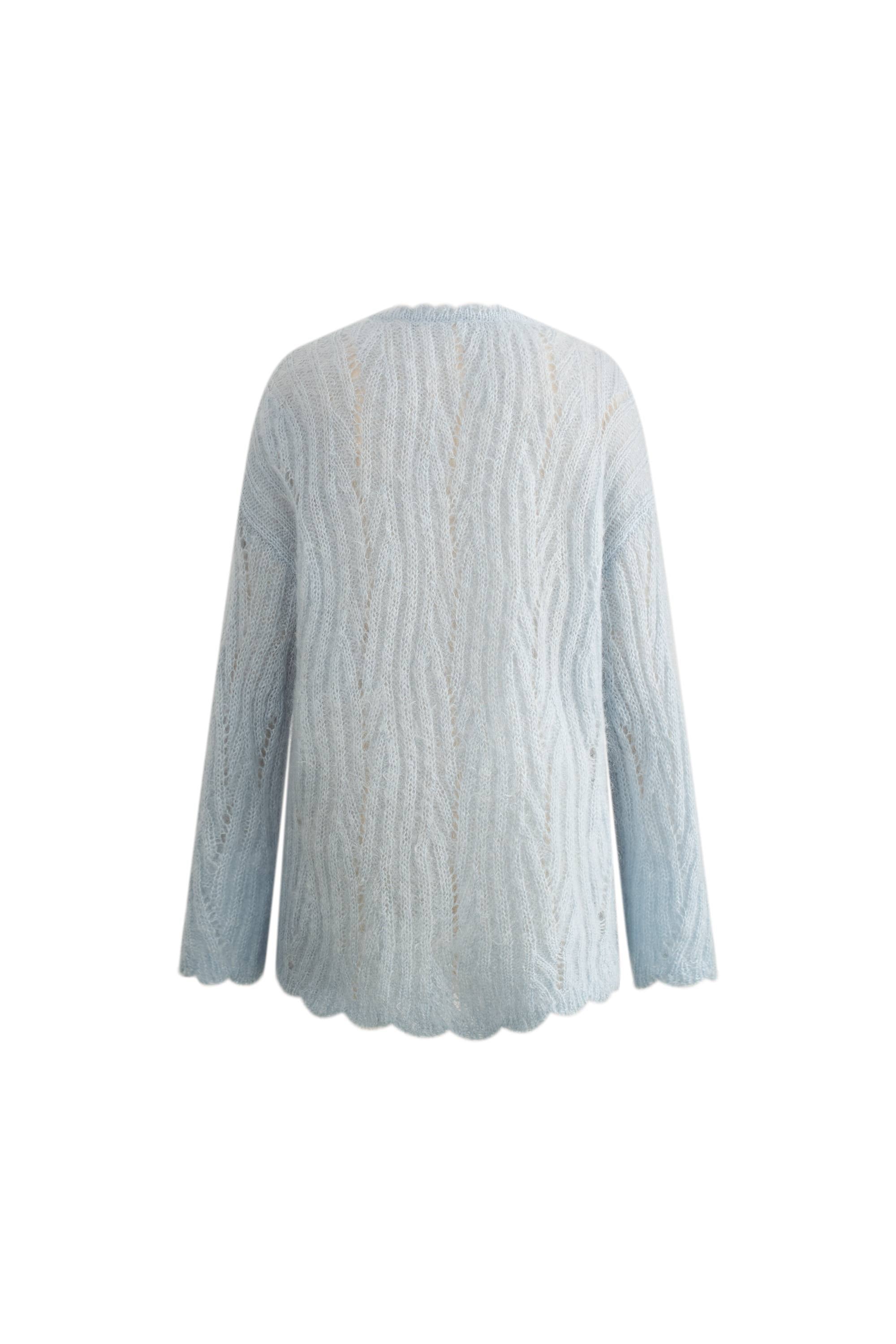 Aki Scalloped Neckline Sheer Cardigan in Lightweight Cable Mohair Knit