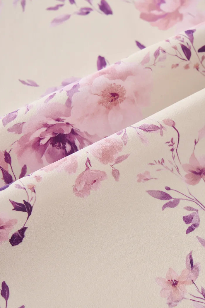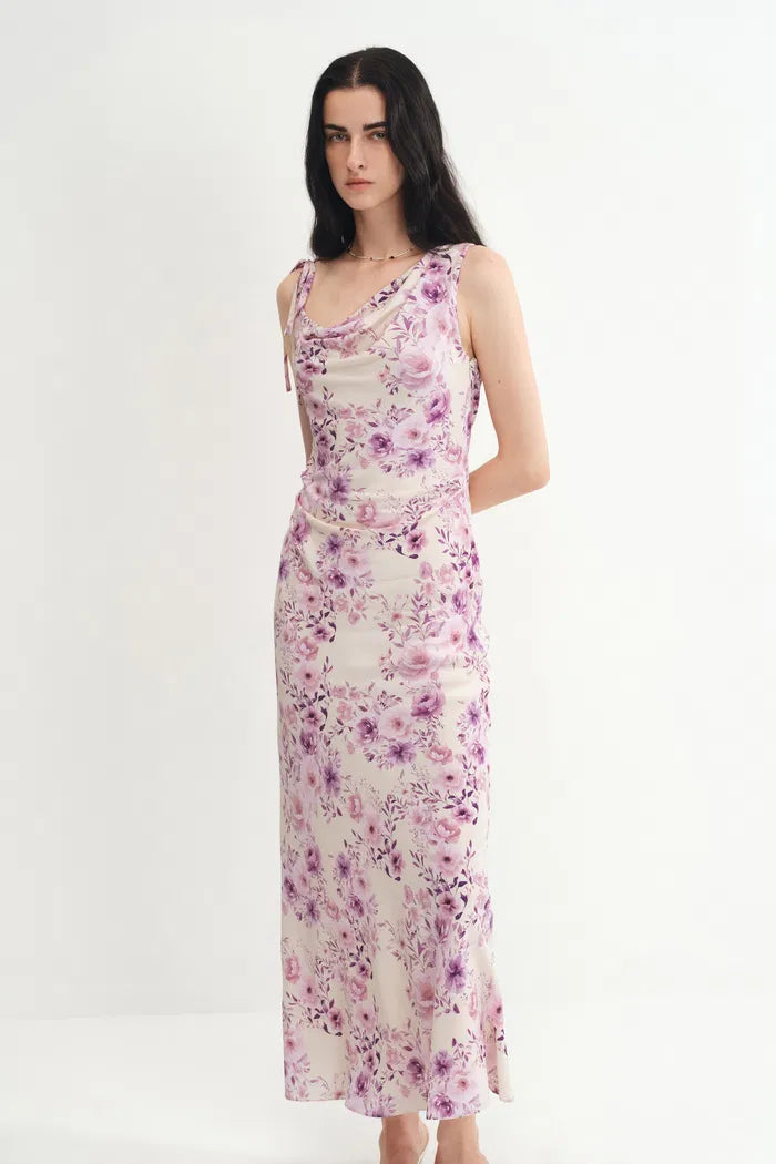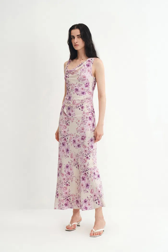 Alice Asymmetrical Cowl Neck Flora Dress in Mulberry Silk Crepe