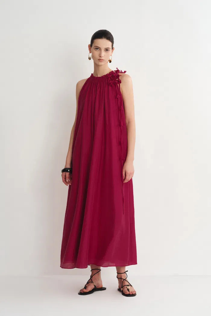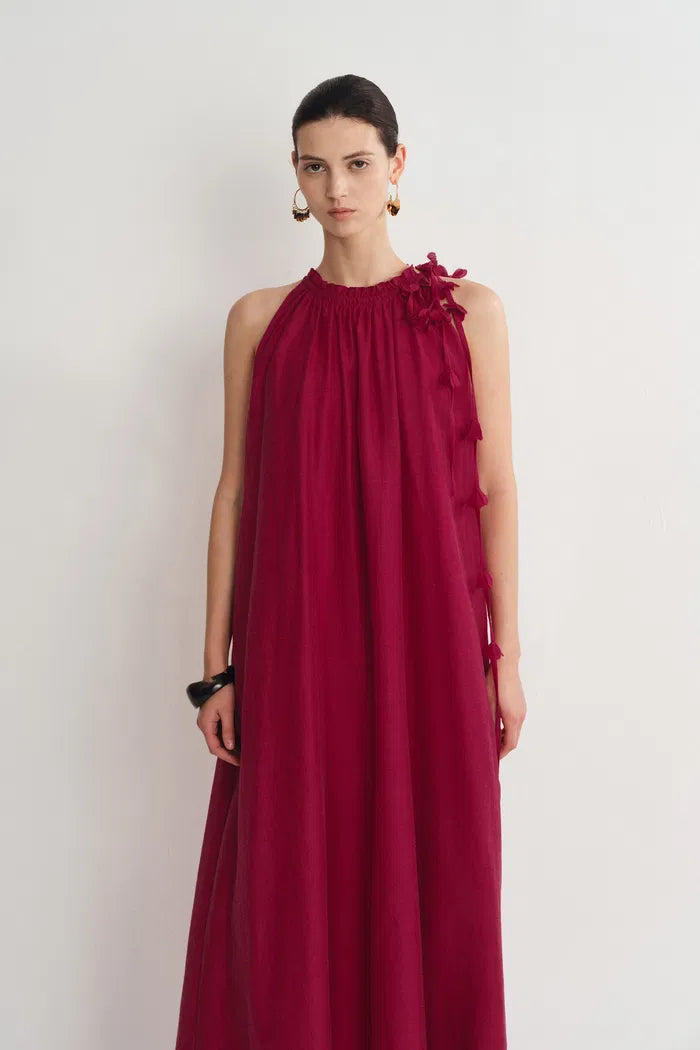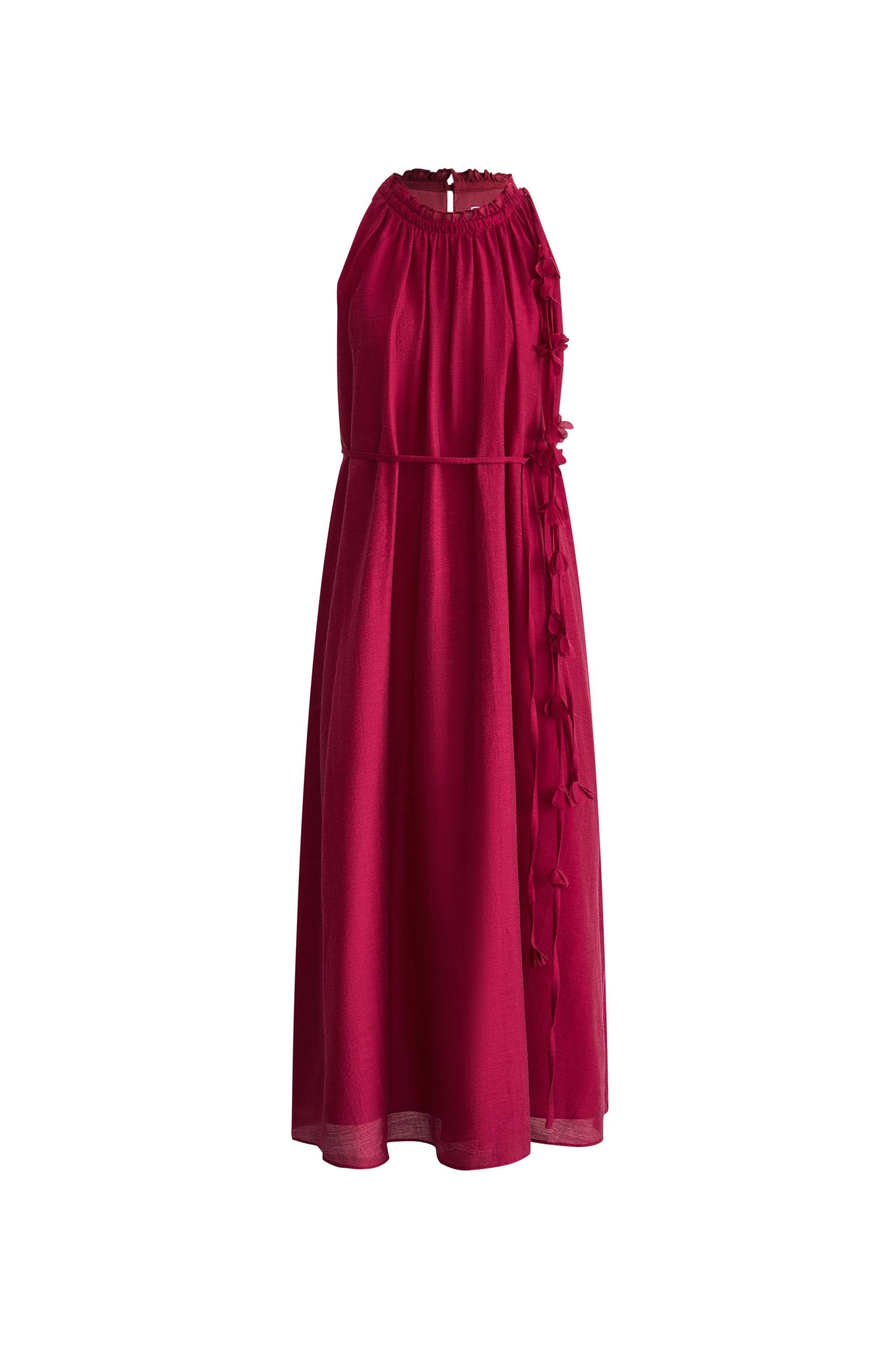 With a halter neckline and handcrafted floral appliqué, this dress brings artisanal touches to vacation dressing. The acetate-linen blend creates subtle texture while remaining lightweight, and the included belt allows for multiple styling options. Your new favorite day-to-night summer piece.