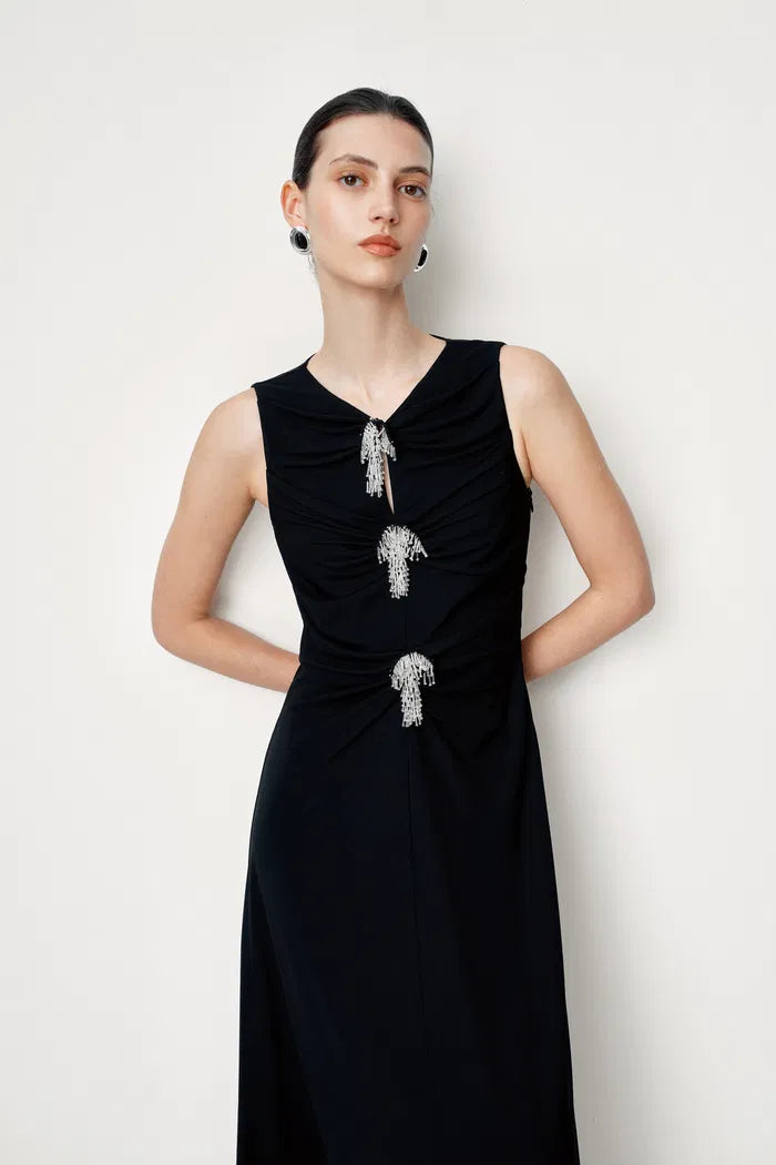 A V-neck and carefully placed pleats make this Alisa dress a summer standout. The stretch knit fabric smooths without constricting, while hand-beaded crystal accents catch the light beautifully. The full skirt moves gracefully with every step—perfect for both day and evening events.