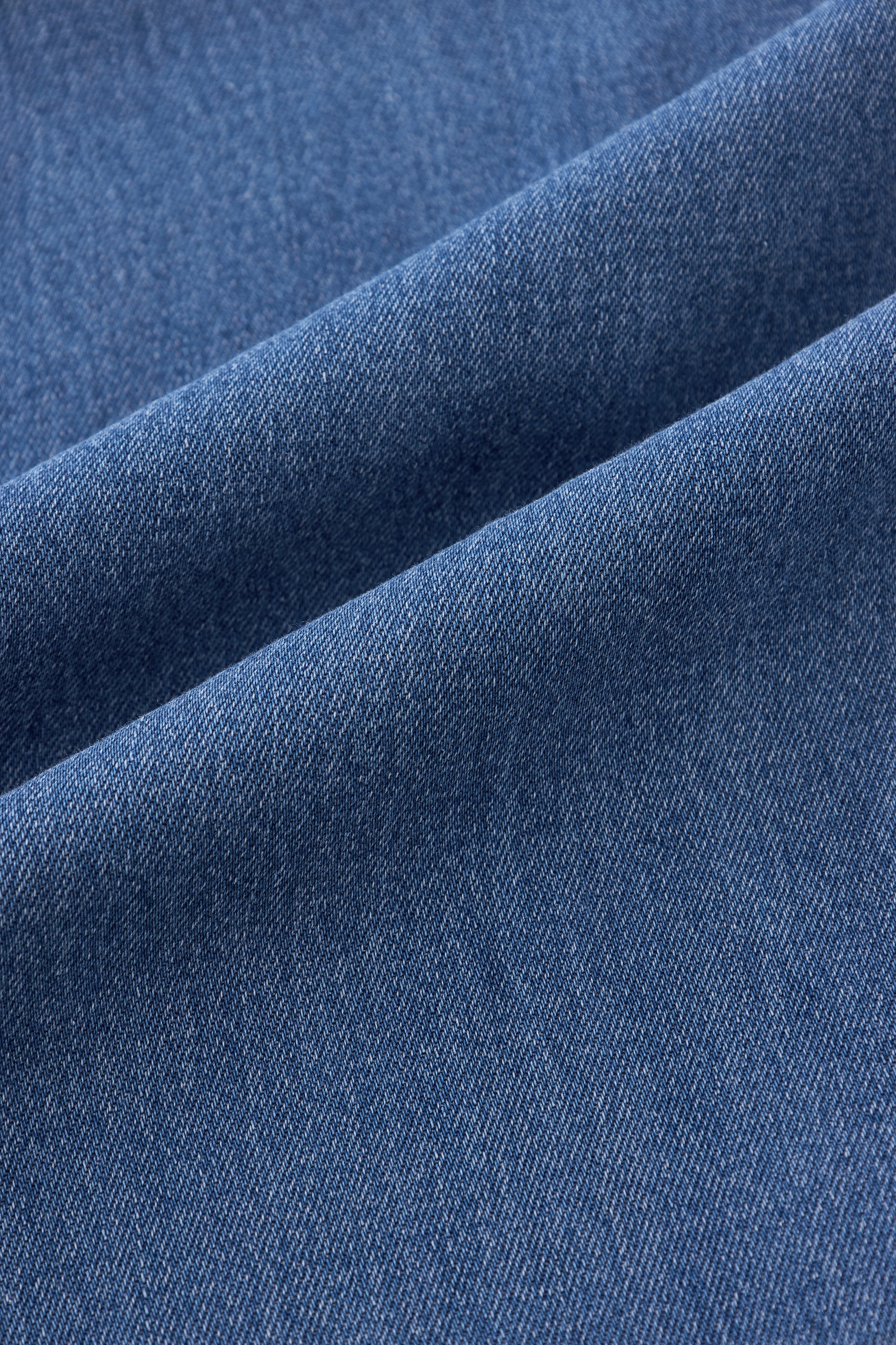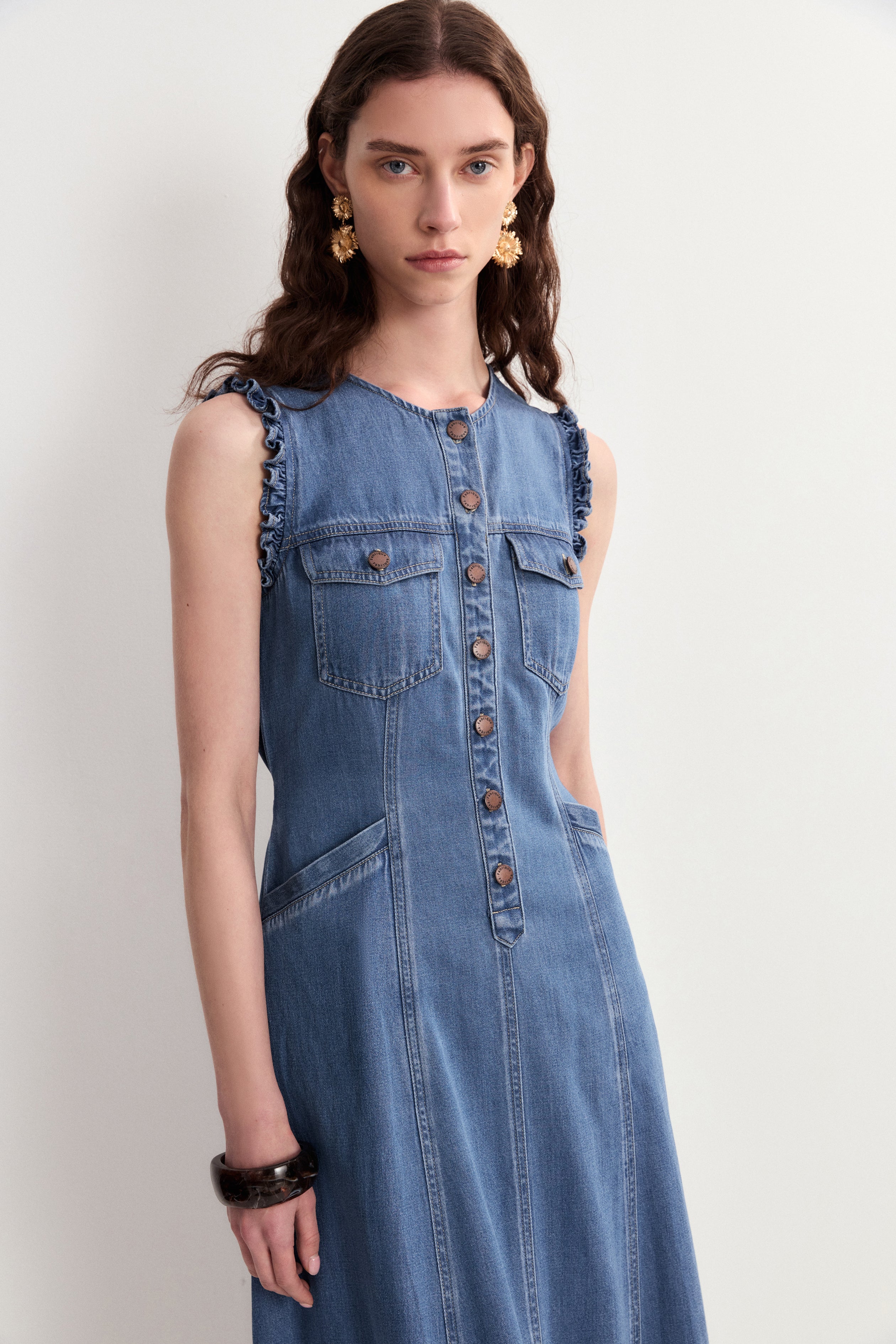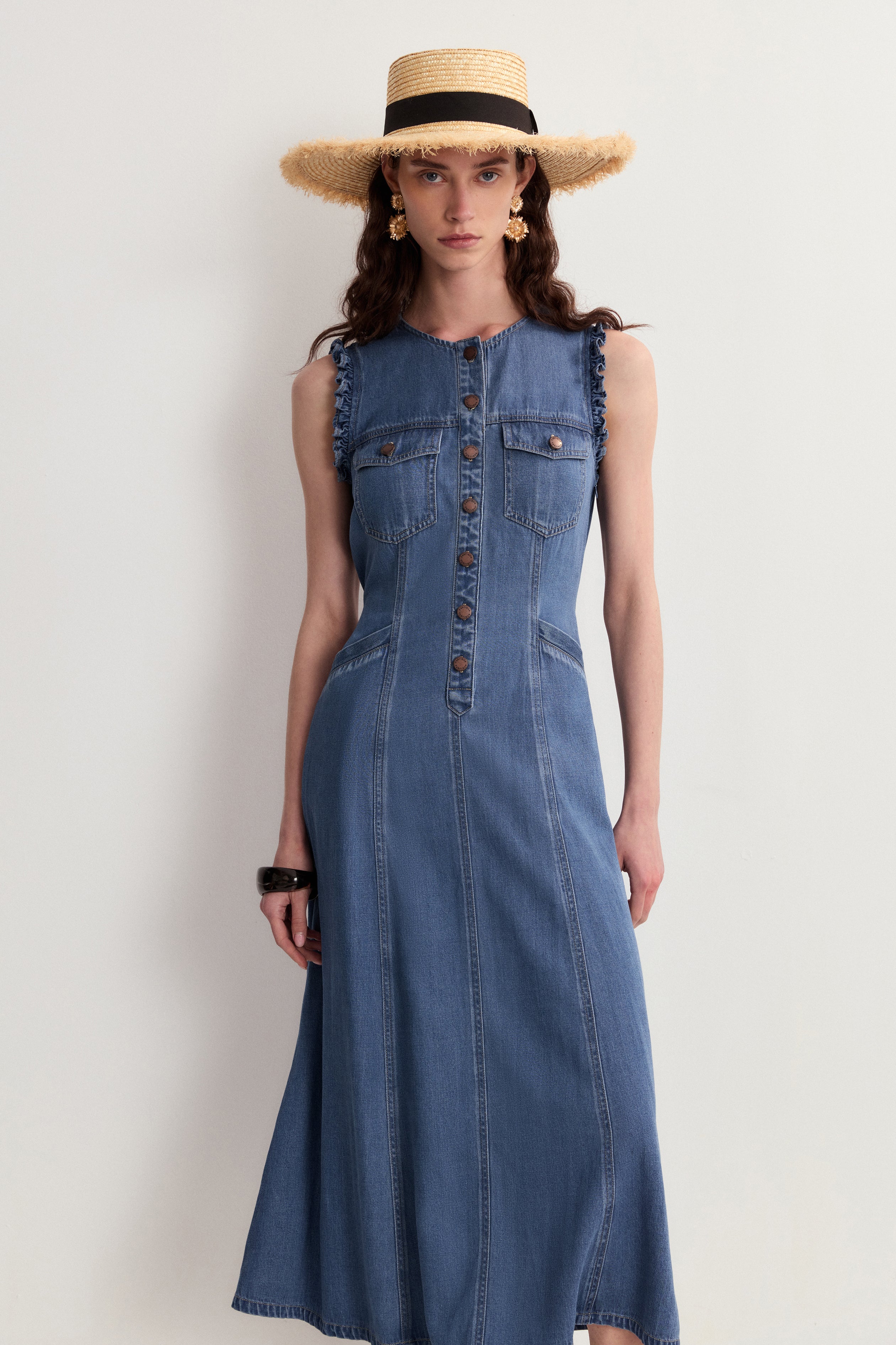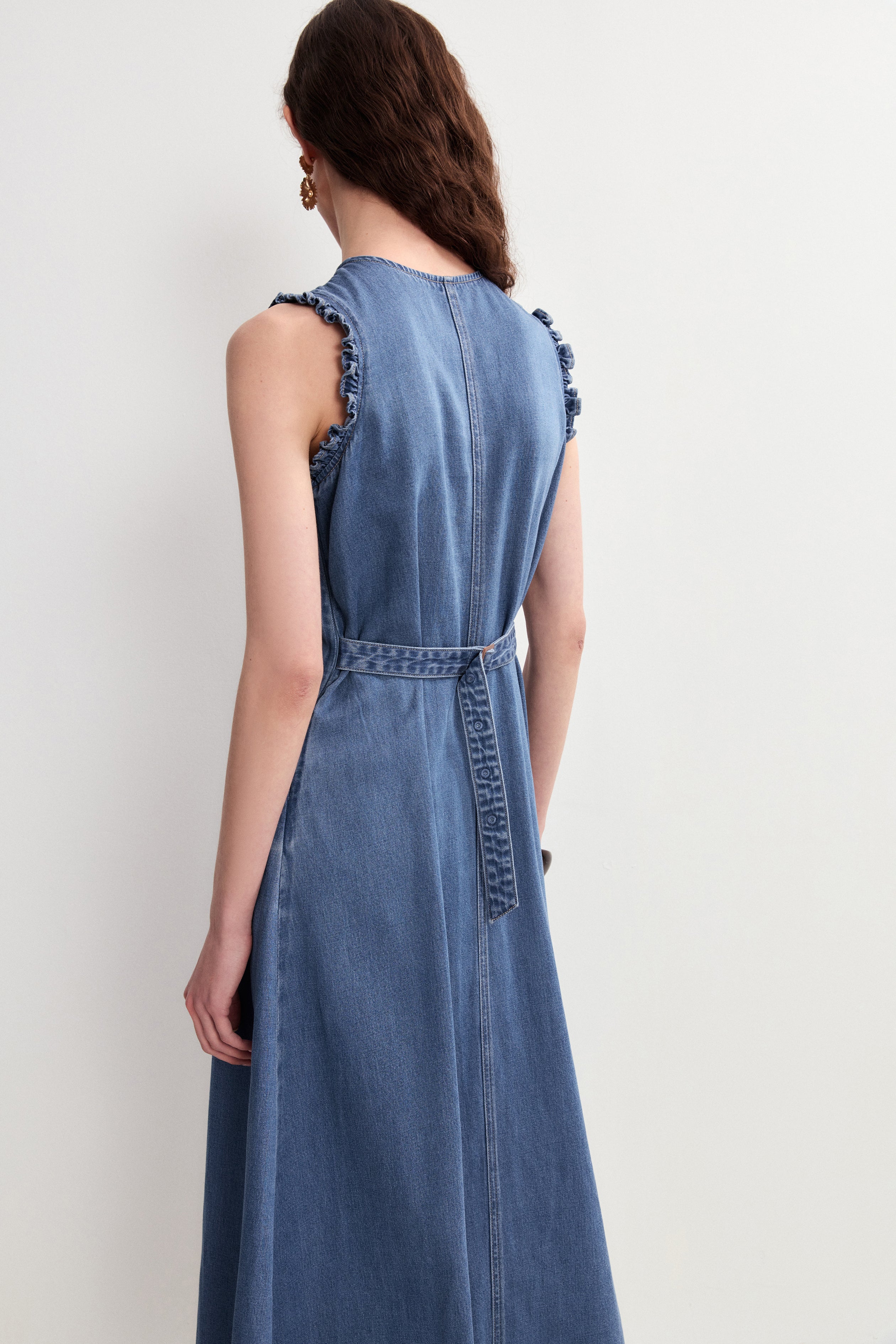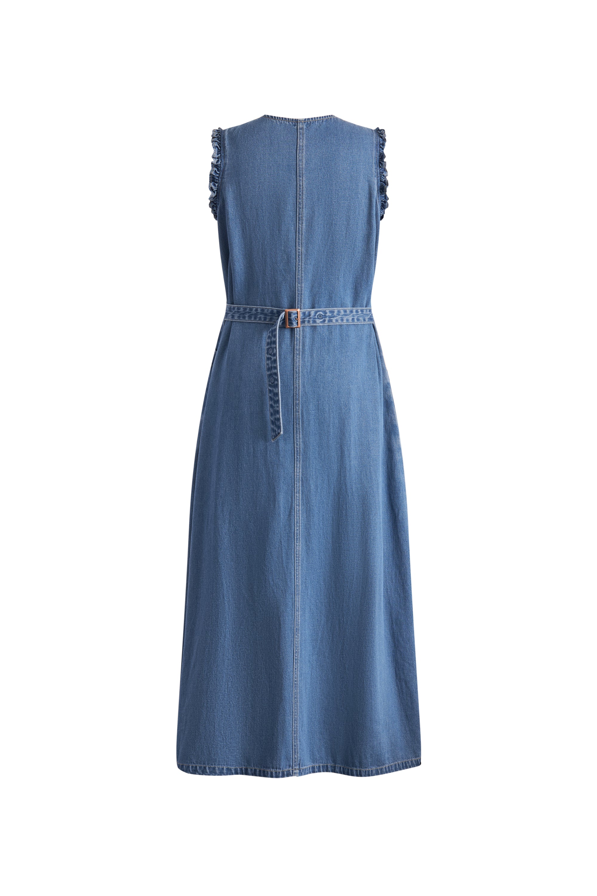 Amelia Scallop Buttoned Cinched Midi Dress in Cotton Linen Denim