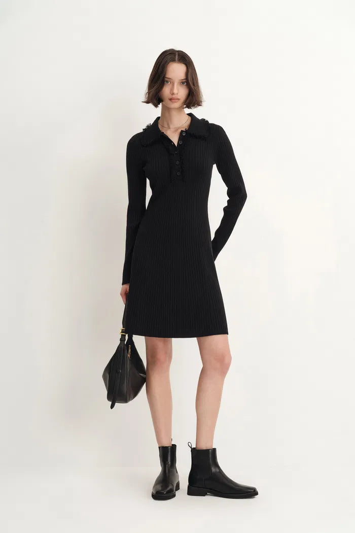 Textured knit construction creates beautiful dimension in this polo-style dress, where fringe collar details add movement and the A-line silhouette in pure merino wool brings comfort to a piece that transitions seamlessly from day to evening.