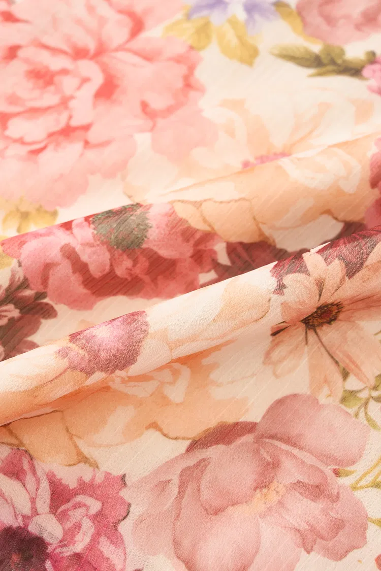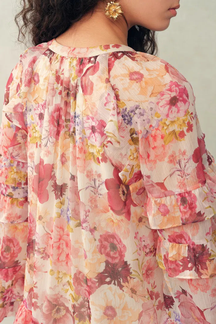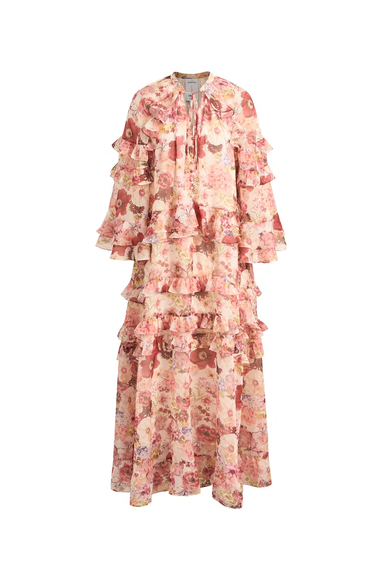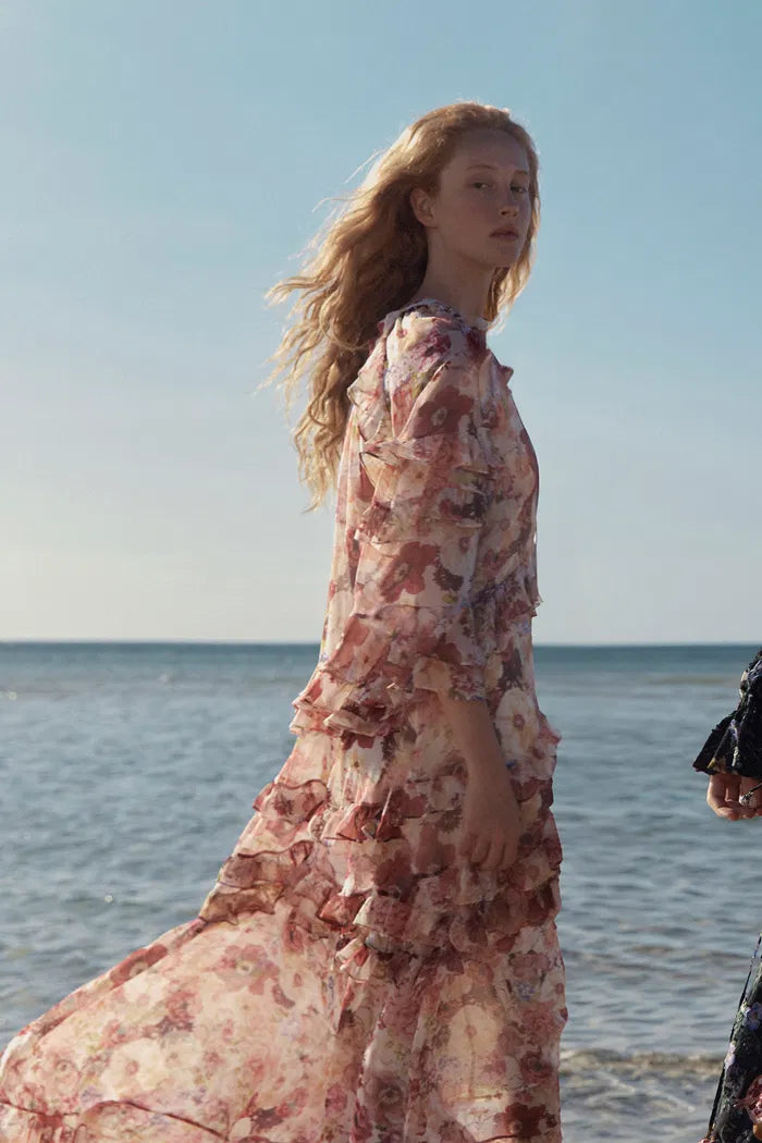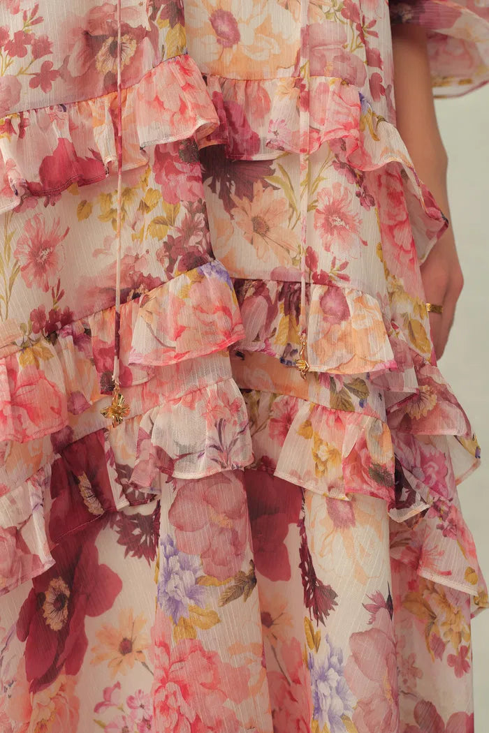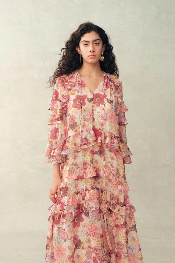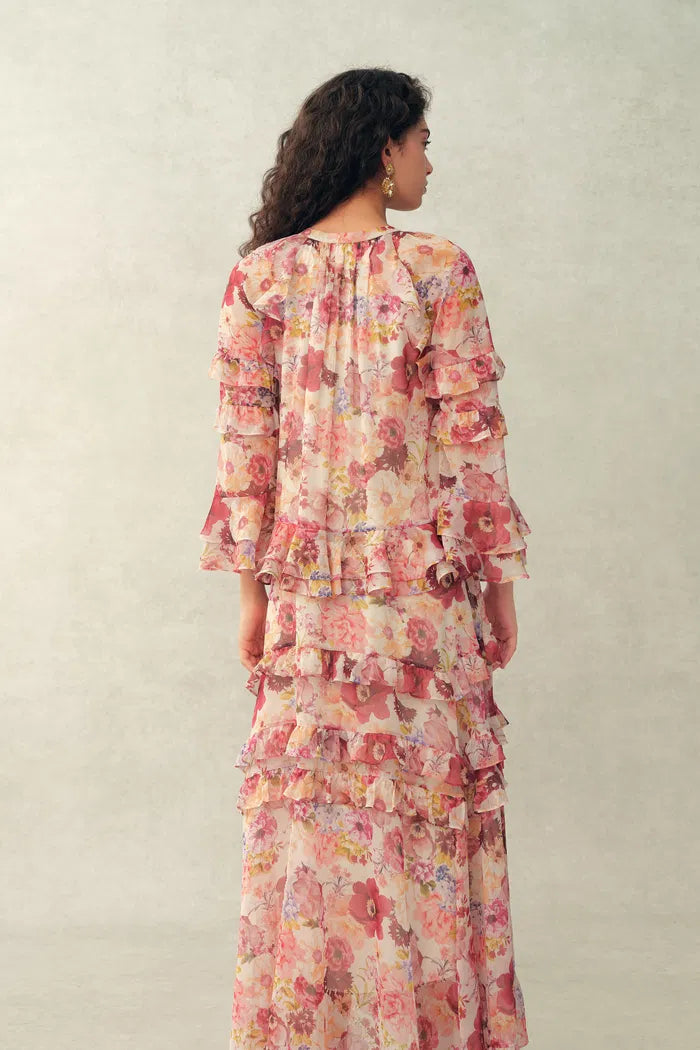 Annette Tiered Ruffle Hand-Painted Print Dress in Sheer Chiffon
