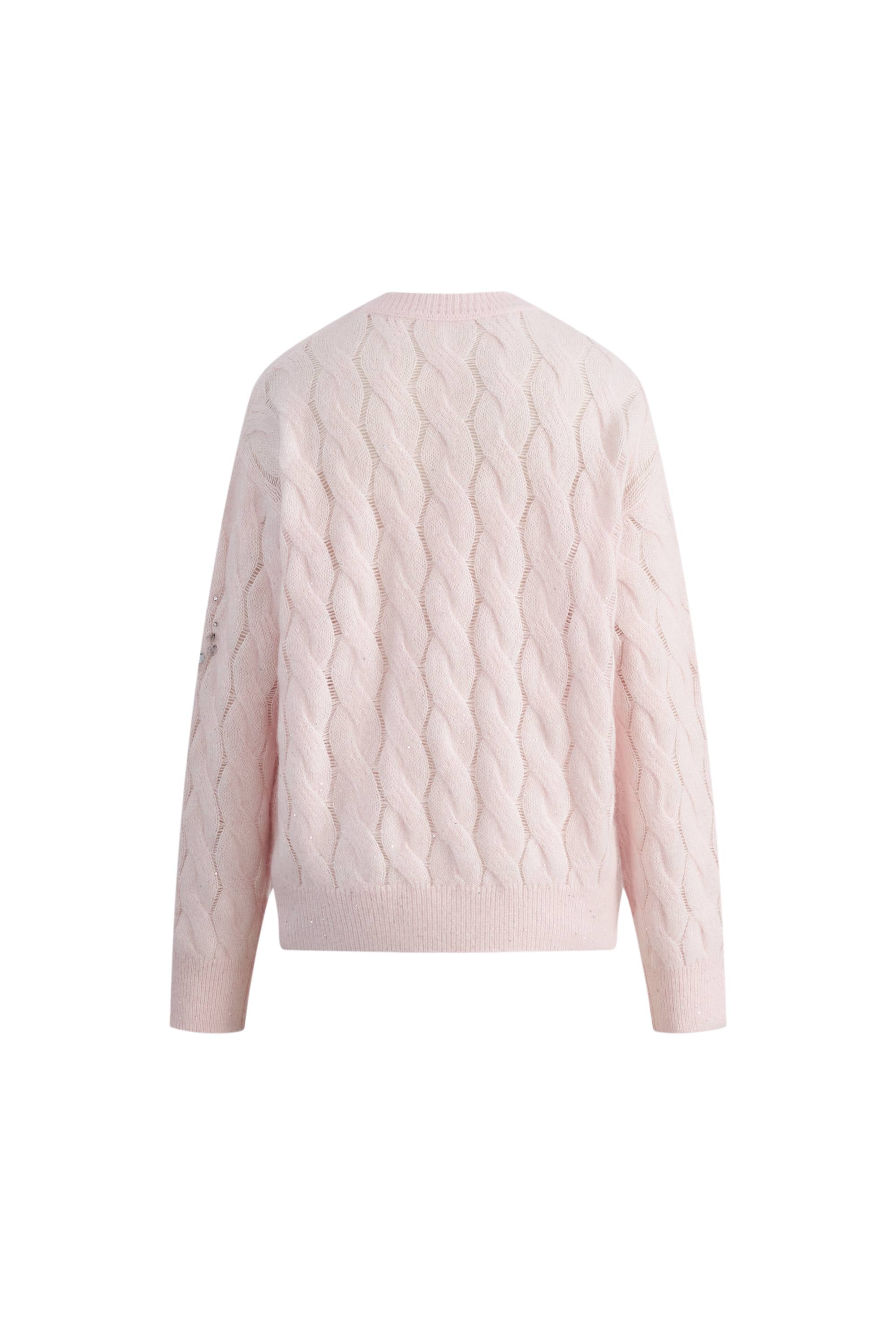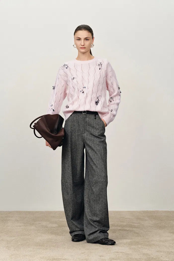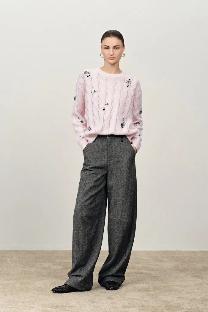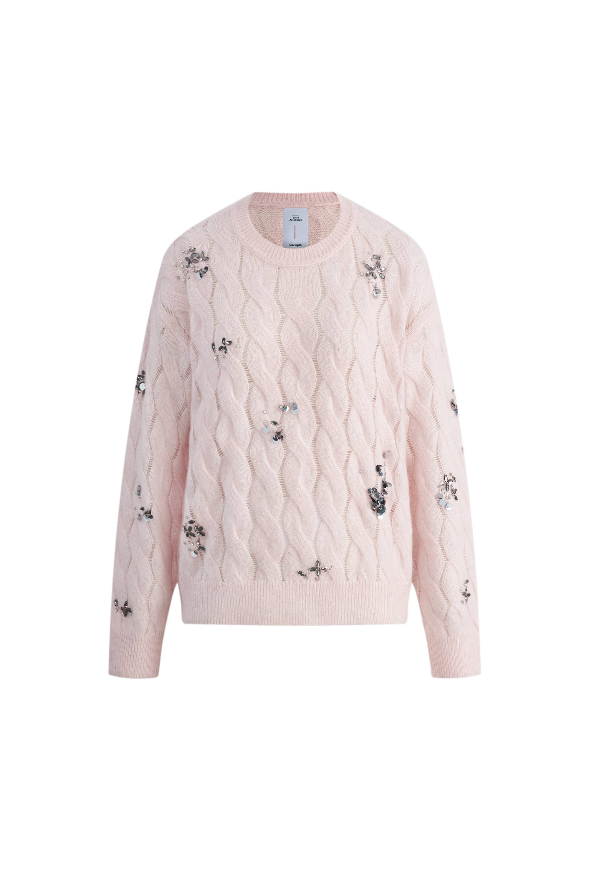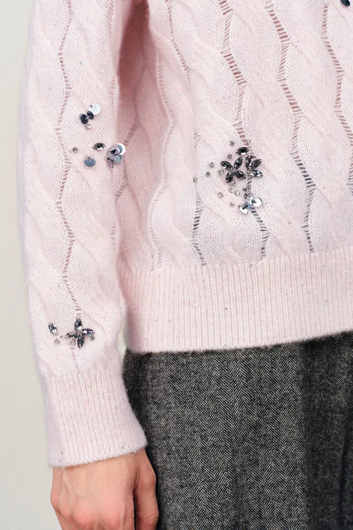 Hand-applied beadwork creates crystalline flower patterns while silk-wool blend provides luxurious softness. Cable texture with openwork patterns adds traditional knit appeal while fitted proportions maintain feminine silhouette.