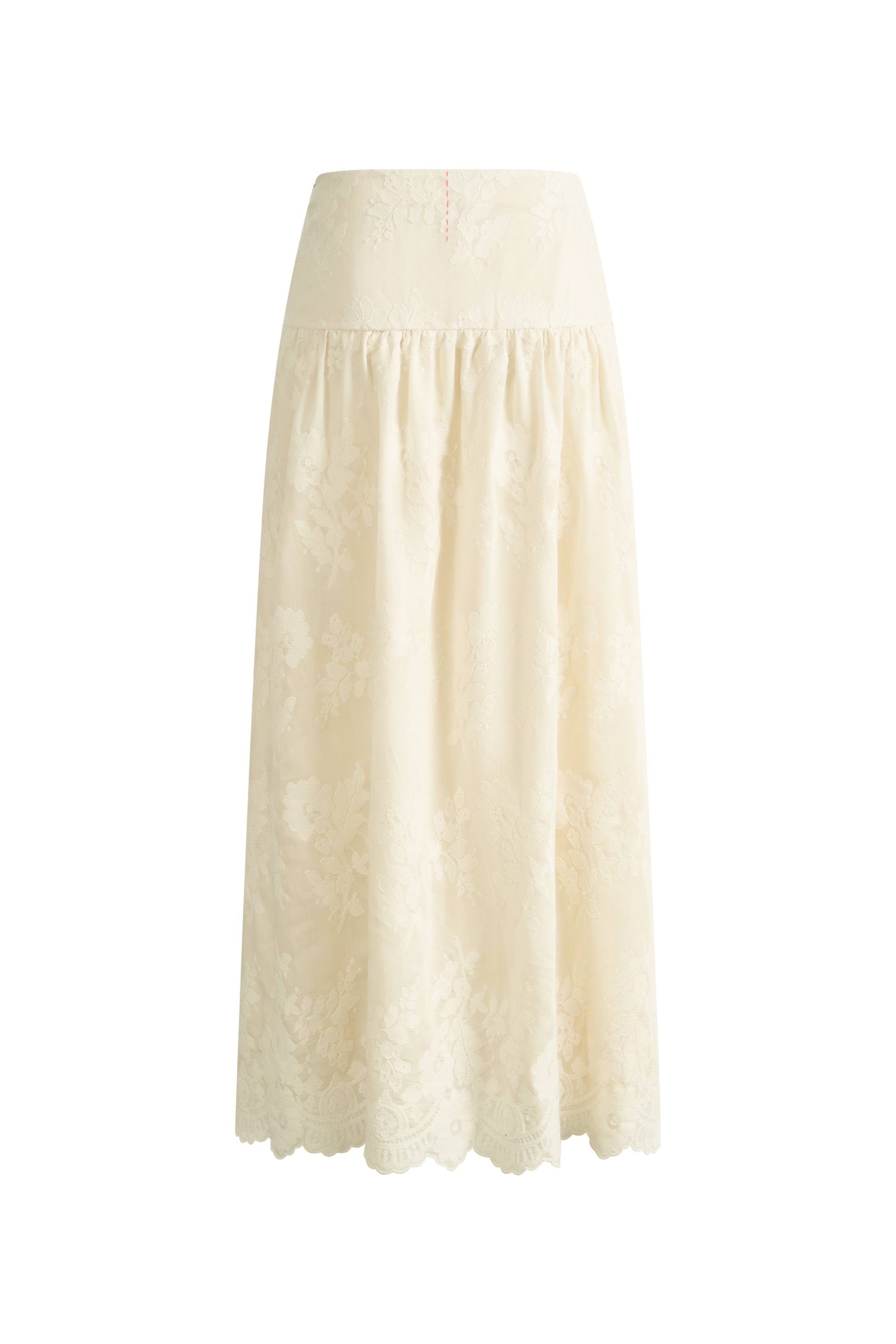 The Bailey Lace Embroidered Midi Skirt features Rococo-style flower embroidery and an umbrella silhouette that enhances proportion with a waist-accenting fit. In elegant ivory white, it reflects a warm spring atmosphere, combines fine mid-high waist cutting with a breathable, skin-friendly lining for comfortable wear.