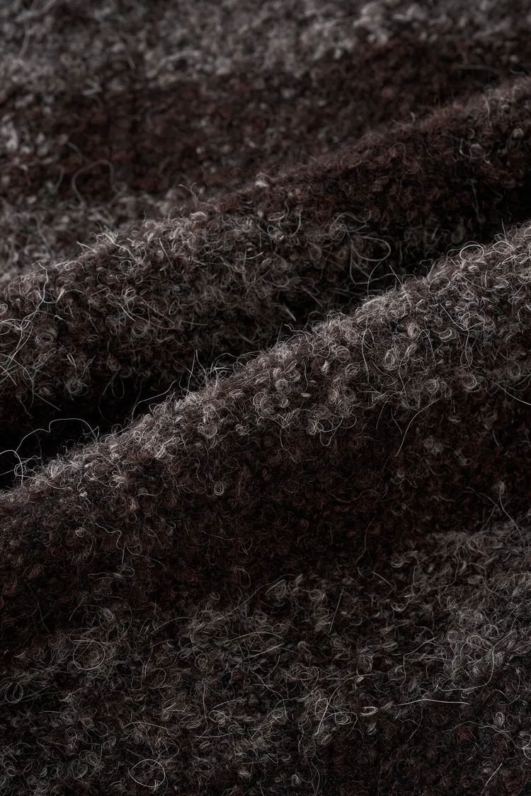 Alpaca-wool blend loop wool with substantial feel. Gray-brown color palette evokes rich dark chocolate while loop texture provides lightweight warmth. May initially have surface fuzz - use lint roller to remove. Substantial, chocolate-like, warm.