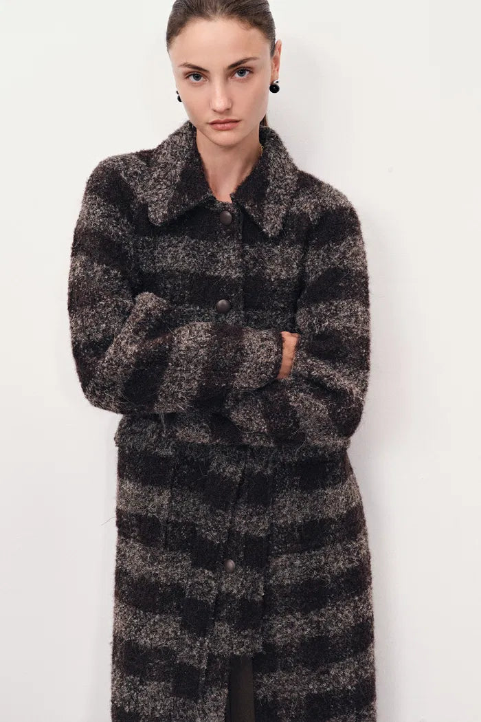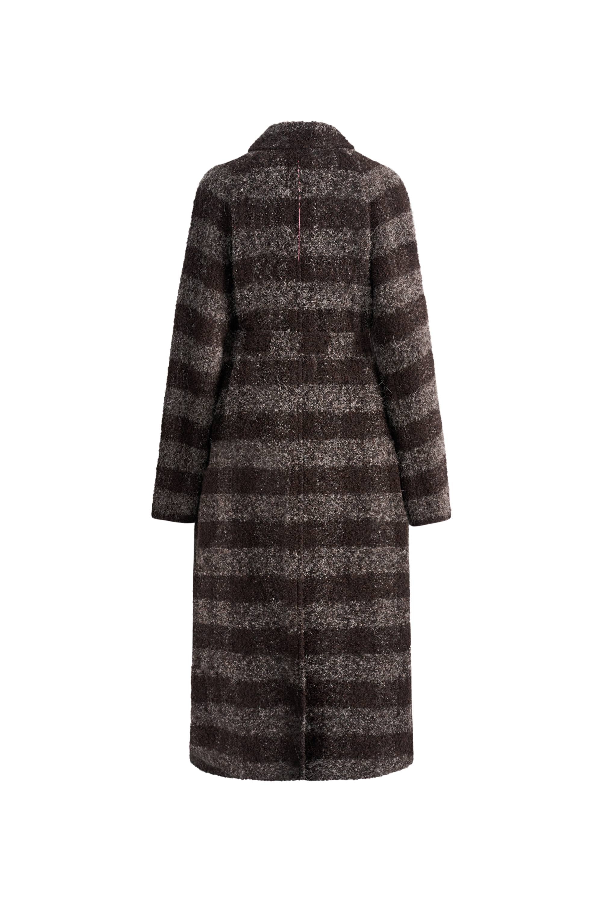 Chocolate-toned bouclé wool creates rich textural depth while leather placket and cuff details add refined structure. The straight silhouette with belt prevents shapelessness while flap pockets maintain practical functionality for daily wear.