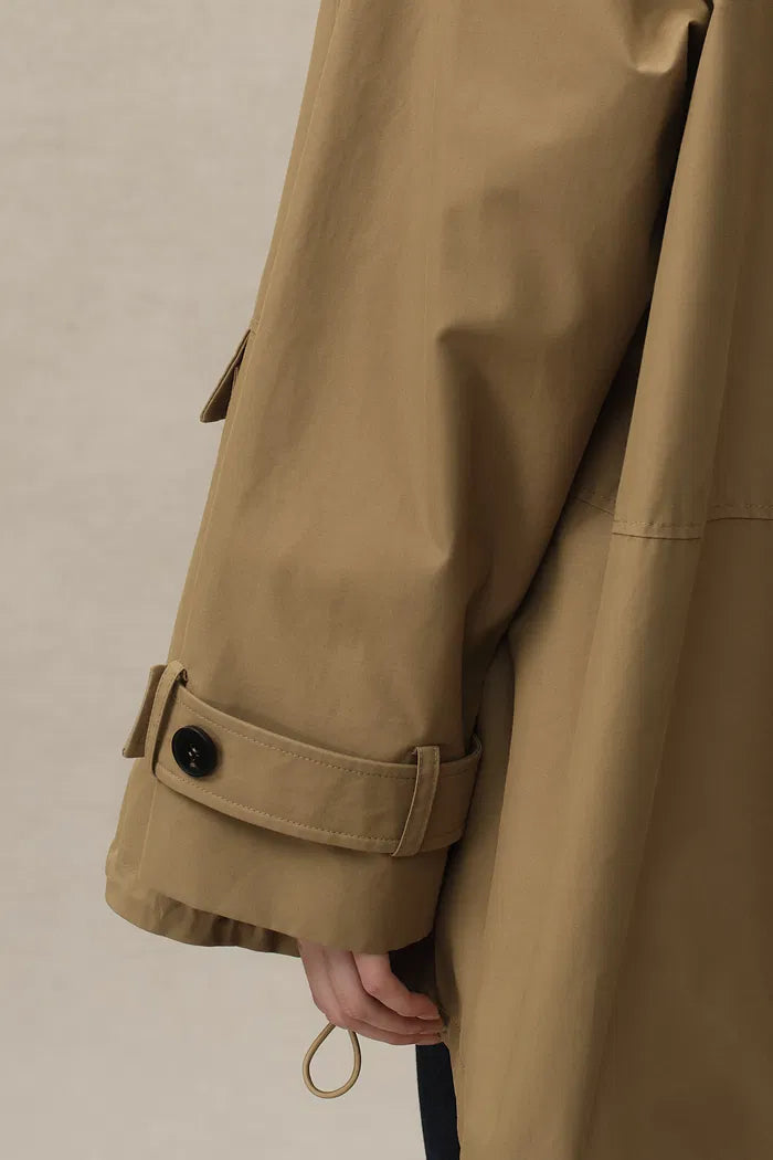 Weather-defying chic in khaki. This short trench plays with proportions – cropped front, flowing back. Detachable corduroy collar adds edge. Your go-to for unpredictable skies and impromptu adventures in style.